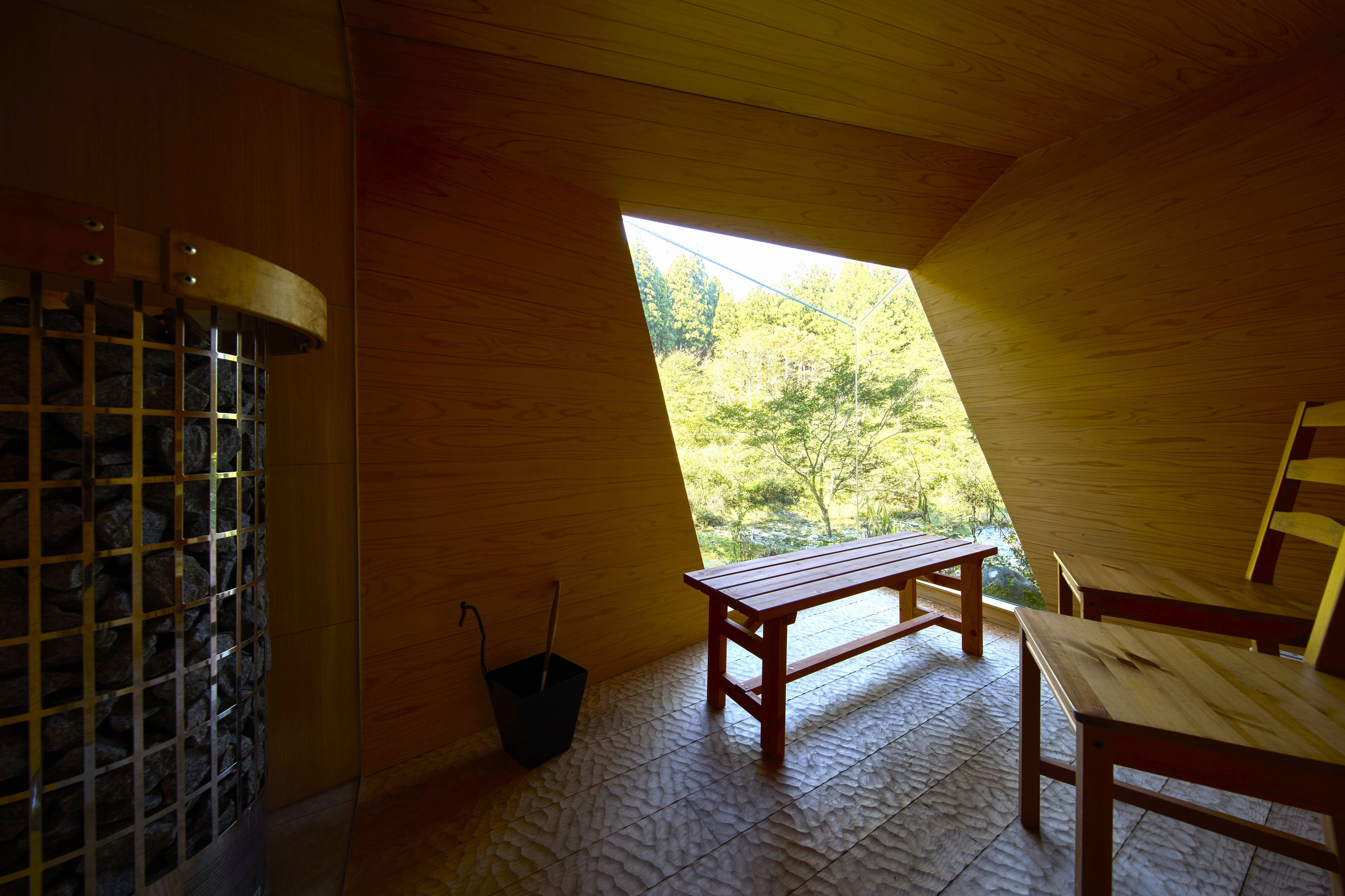 ヒノキの香りが漂うサウナ室には、大きく迫り出した窓があり、川の流れや木々の彩りを眺めながら身体を温めることができます。セルフロウリュに対応したサウナストーンを備え、温度・湿度を好みに合わせて調整できる点も魅力です。