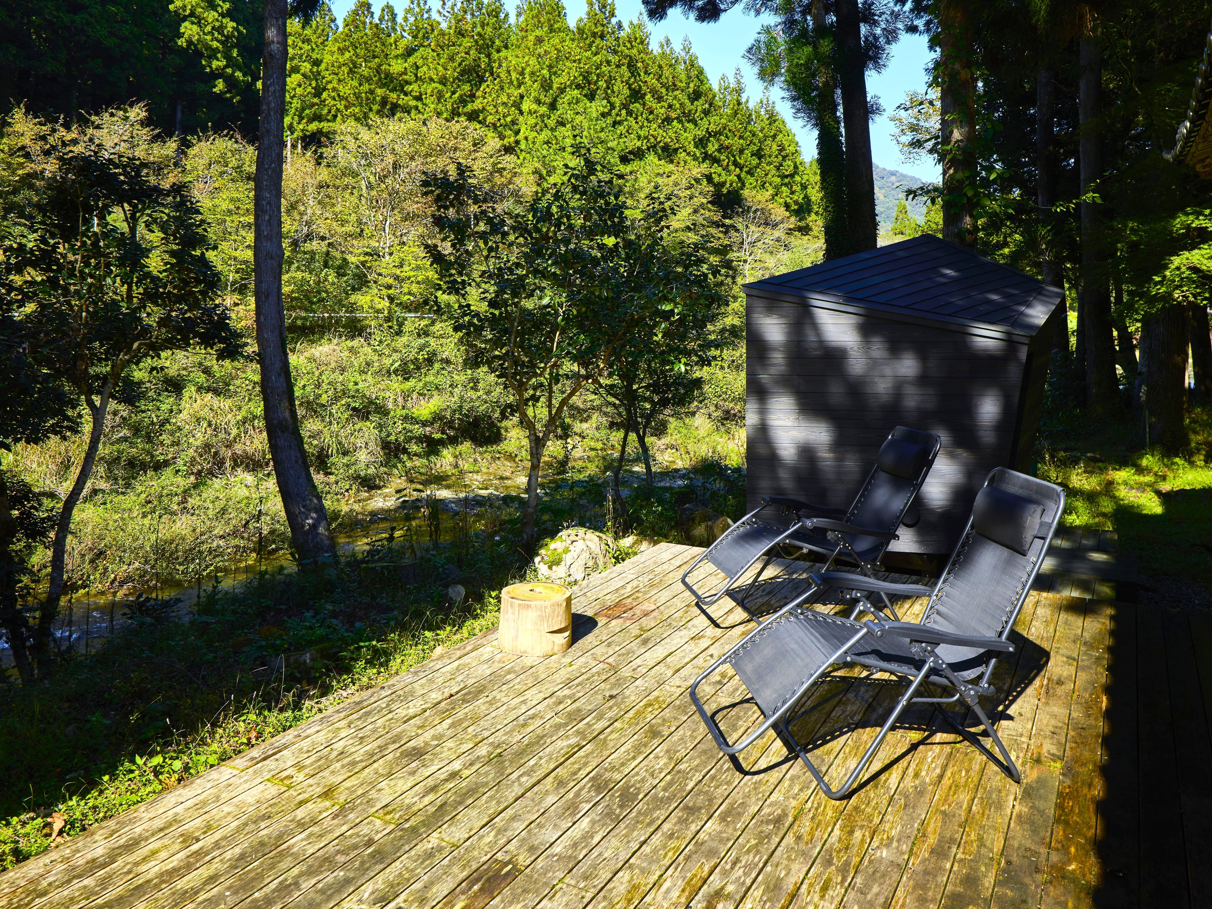 屋外には大杉谷川を望むウッドデッキが広がり、川の流れや風の音、鳥の声を聞きながら穏やかな時間を過ごすことができます。「下里」専用のプライベートサウナも併設し、自然と一体になるような滞在を楽しむことができます。