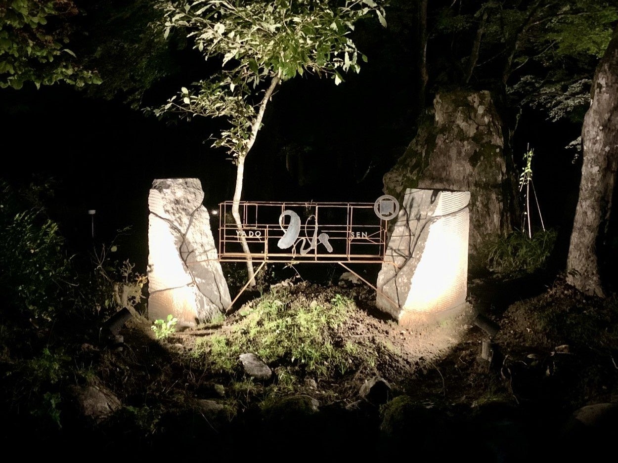 また、「下里」敷地内入口に、地域の鉄職人・造形作家である酢馬 慶太氏(IRON WORKS KORU)が滝ヶ原石と鉄造形を組み合わせて制作した【仙】のアート看板を新設いたしました。光の当たり方で陰影が変化する“仙”の文字と、石・鉄の素材が調和し、自然と寄り添う宿の世界観を表現しています。