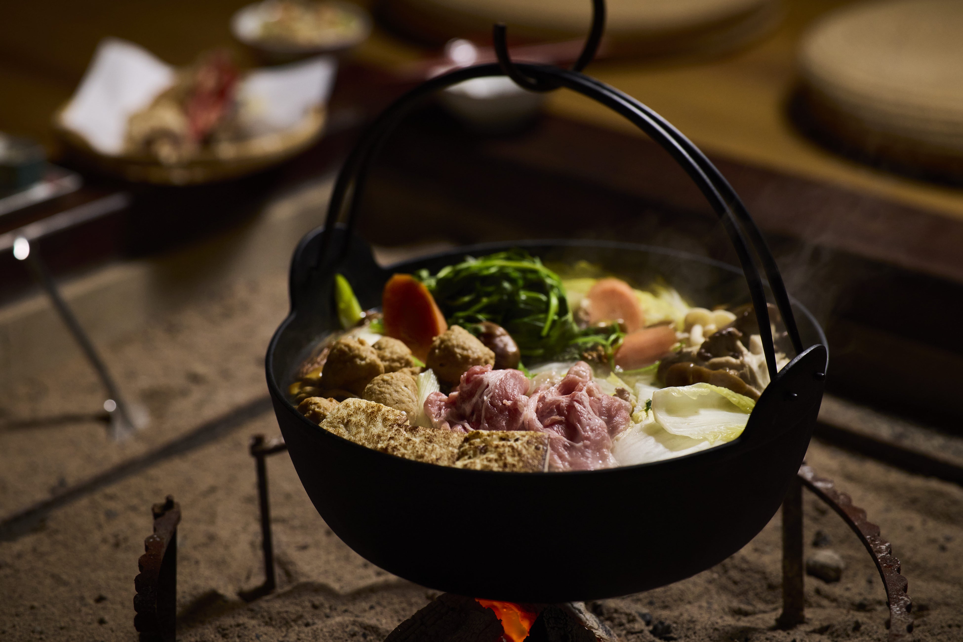 「下里」では囲炉裏でのご提供も可能です。囲炉裏を囲む穏やかな団らんの中で、古き良き日本の食卓文化をゆっくりと感じていただけます。