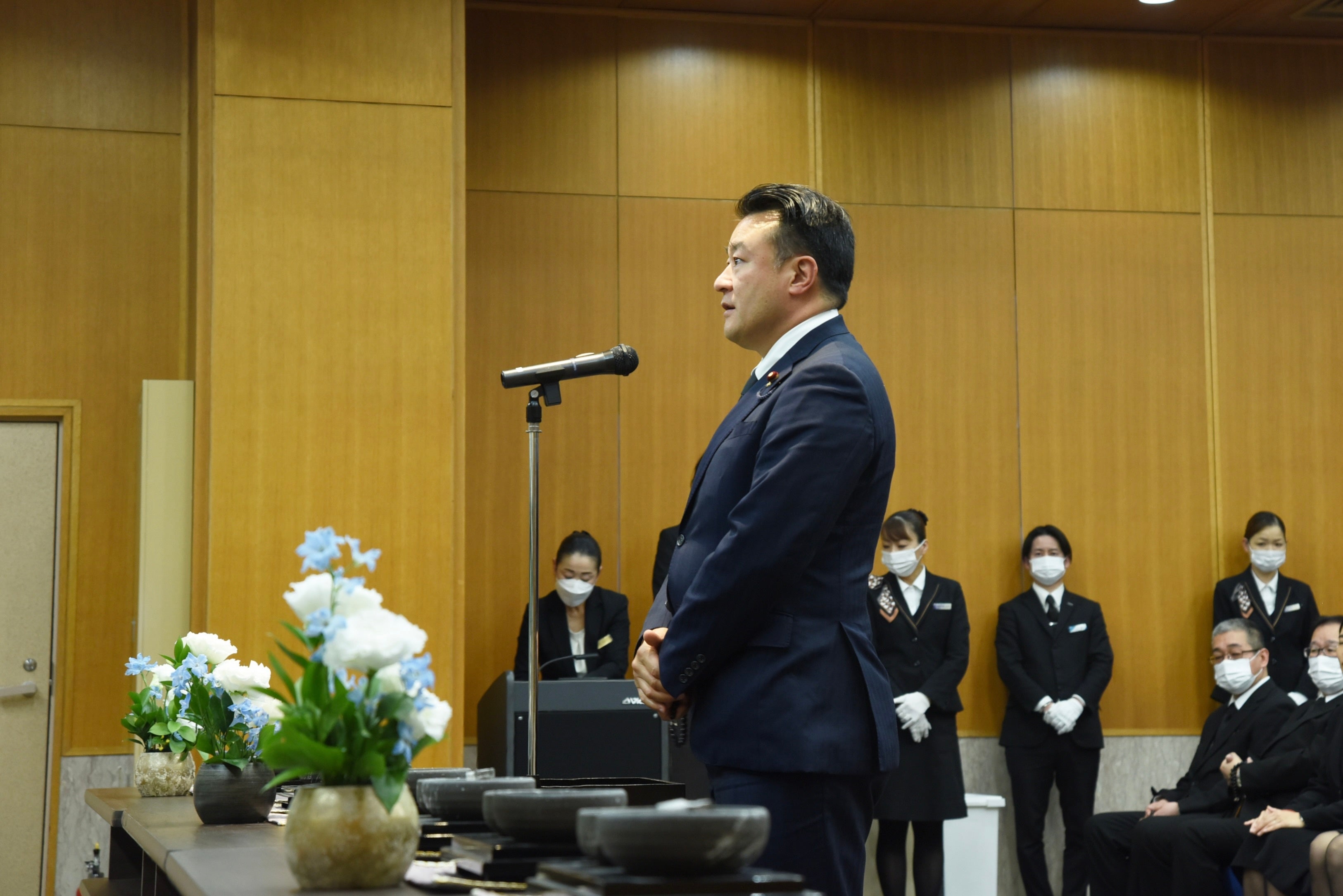 式中では、衆議院議員 大岡敏孝様をはじめ、故人とゆかりの深い関係者の皆様より弔辞を賜りました。また、社員を代表し、弊社 常務取締役 小松貴浩より弔辞が述べられました。