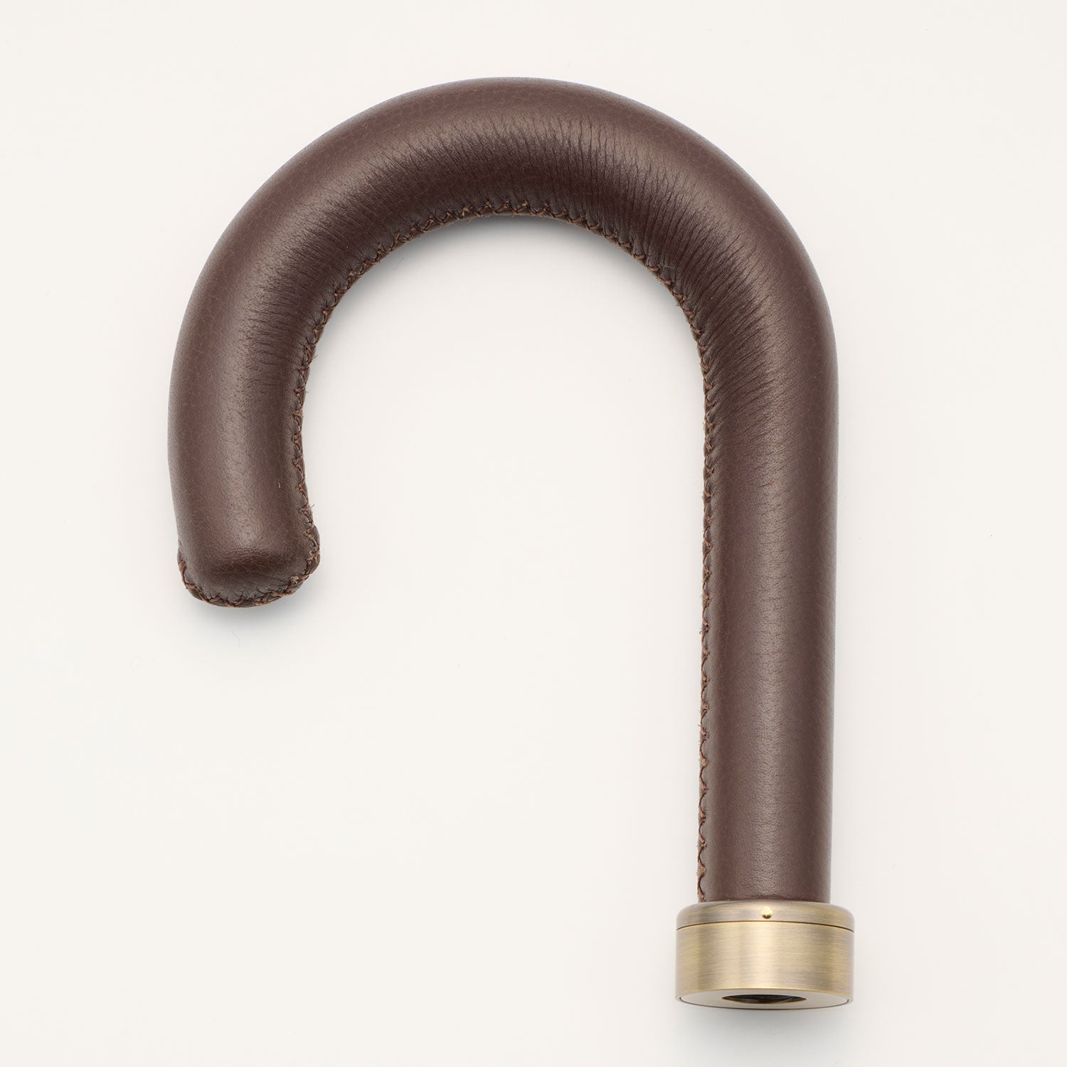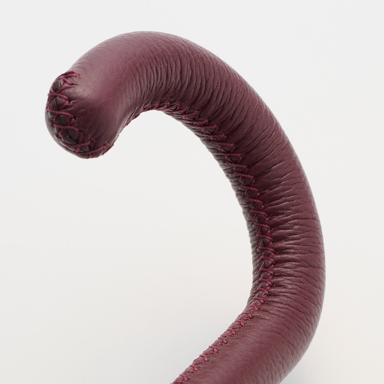 レザーは世界的にも評価の高いパキスタン原産で、厳しい国際基準をクリアした工場で加工されています。染ムラが出ないようにしっかりと染められた革は滑らかな質感が特徴です。手元の土台に革を巻き、手縫いで一針ひとはり丁寧に縫製します。特に手元は一般的な革製品に比べ特殊な形状により加工が難しいのが難点です。曲がりの内側部分では、シワを寄せながら中に巻き込むように縫い続ける点で非常に高度な技術が必要となります。熟練の革職人が縫製した無駄のない縫い目は整然と心地よく、ずっと眺めていたくなる仕上がりです。