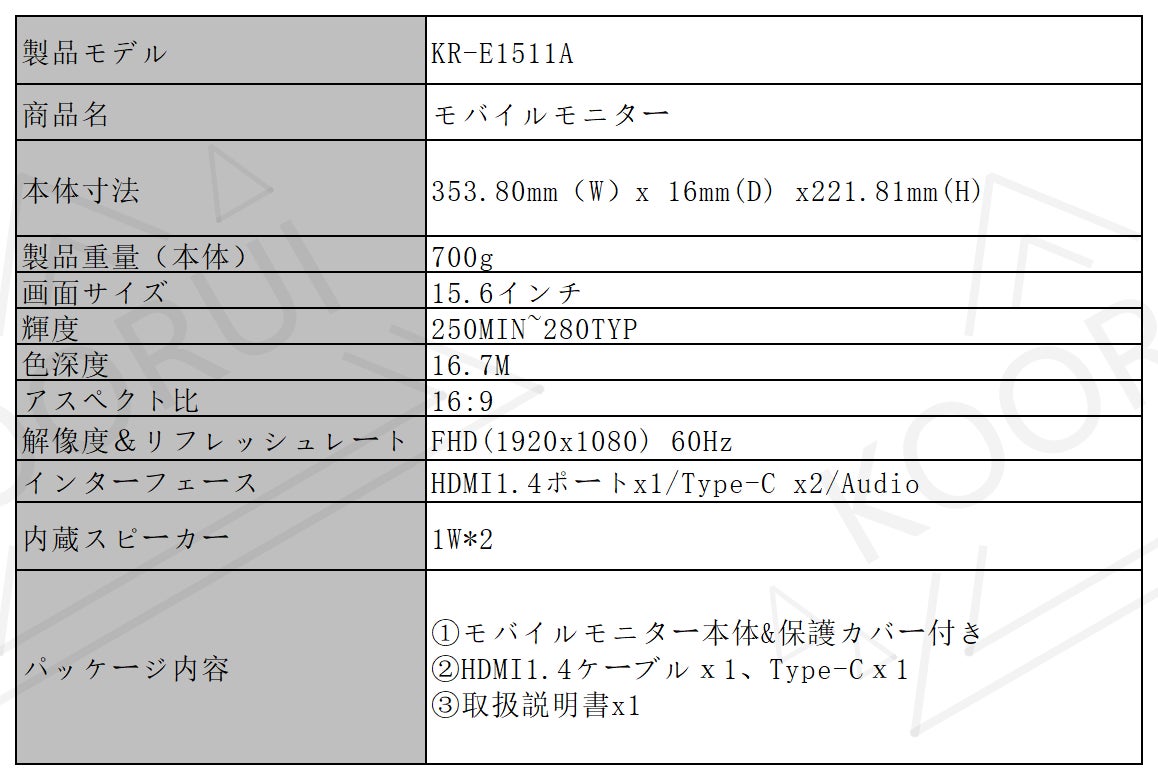 ■KOORUI 15.6インチ モバイルモニター E1511Aのスペック概要