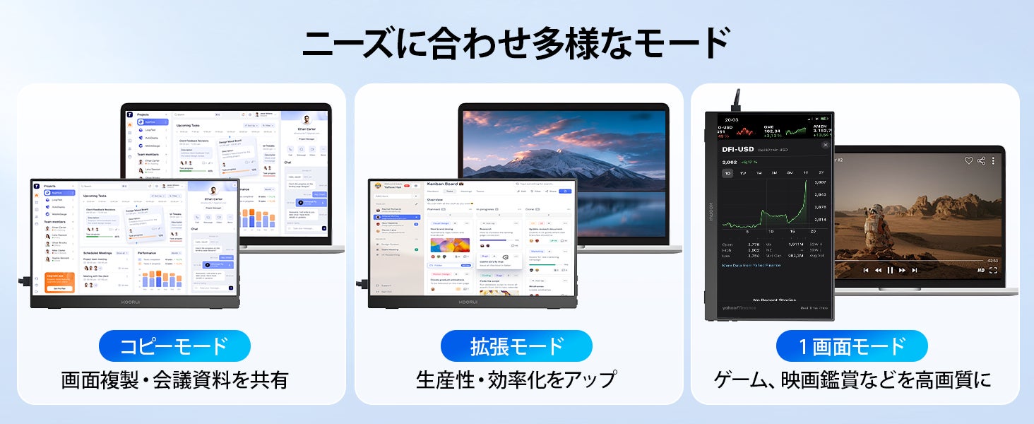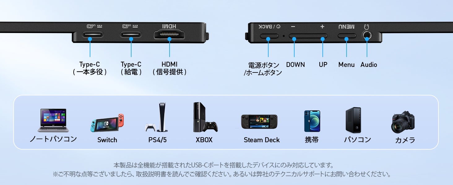 USB Type-CとDisplayport端子を搭載し、ケーブル1本で映像・音声・給電が可能。PC、MacBook、スマートフォン、Nintendo Switch、PS5など、さまざまな機器と簡単に接続できます。内蔵スピーカーにより、外出先でも迫力あるサウンドを楽しめます。