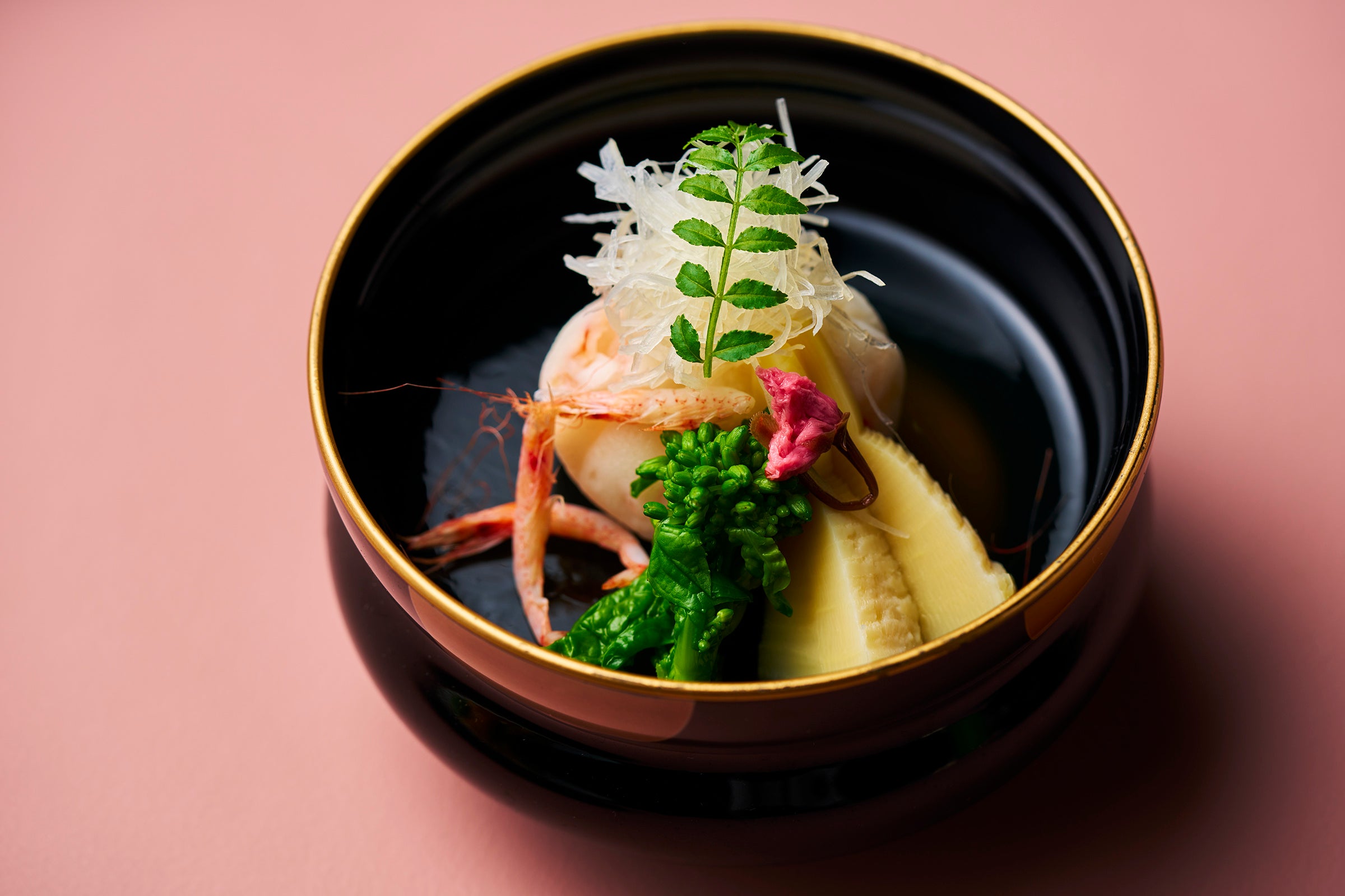 お吸い物:桜海老真丈・竹の子・白髪葱・桜花木の芽