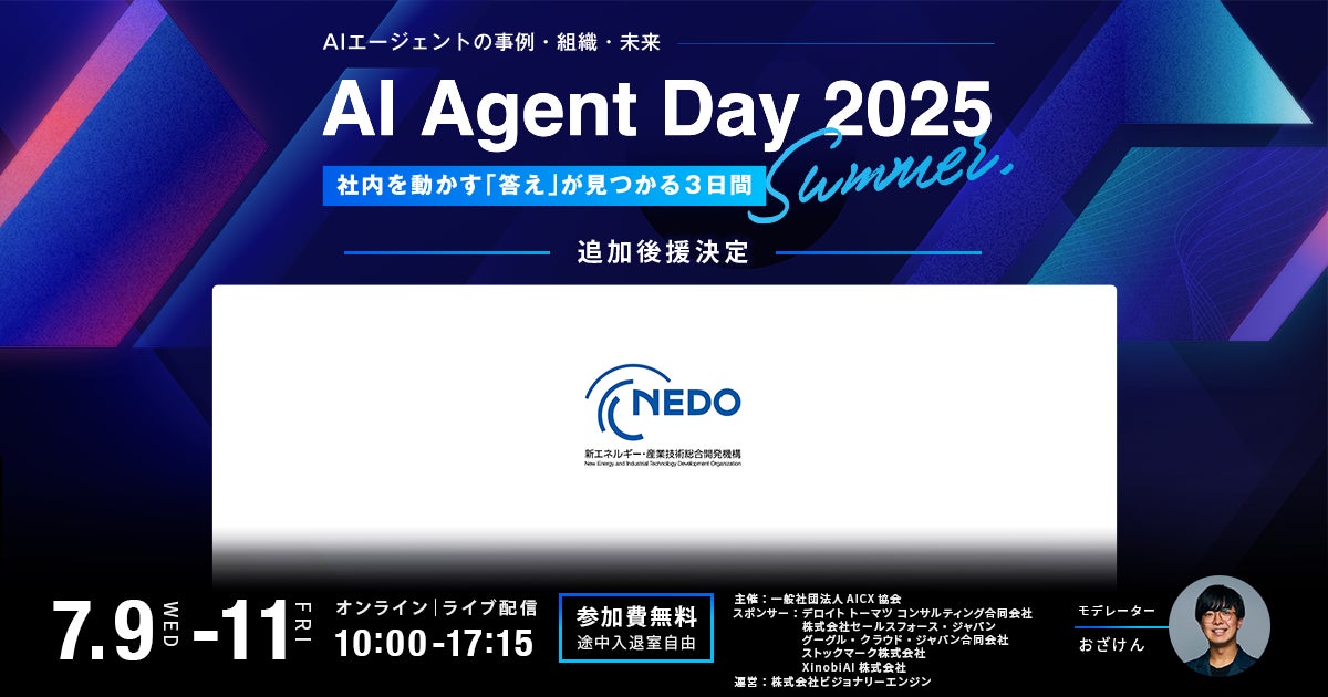 生成AI技術を活用したAIエージェントの社会実装を推進し、顧客体験(CX)の変革を目指す一般社団法人AICX(AI Customer Experience)協会(東京都、代表理事:小栗 伸、小澤 健祐、以下、AICX協会)は、2025年7月9日(水)〜11日(金)に開催するAIエージェント活用の最前線を共有するカンファレンス 「AI Agent Day 2025 Summer」において、国立研究開発法人 新エネルギー・産業技術総合開発機構(NEDO)が後援団体として新たに参画したことをお知らせいたします。