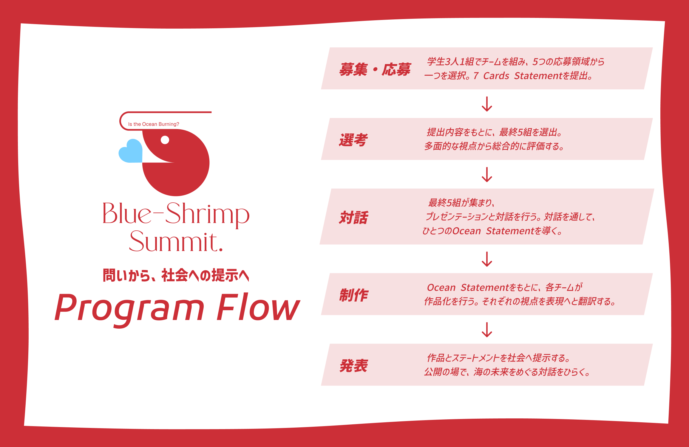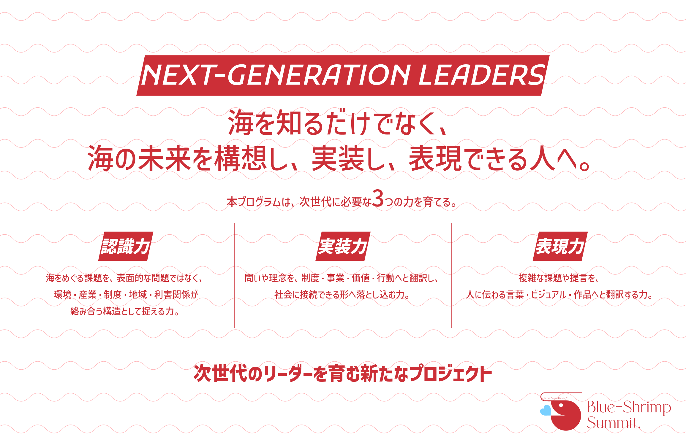 Blue-Shrimp Summit.は、その中核となる次世代リーダー育成プログラムとして位置づけられ、学生を中心とした次世代が、海の未来を構想し、社会に接続していく実践の場を担います。