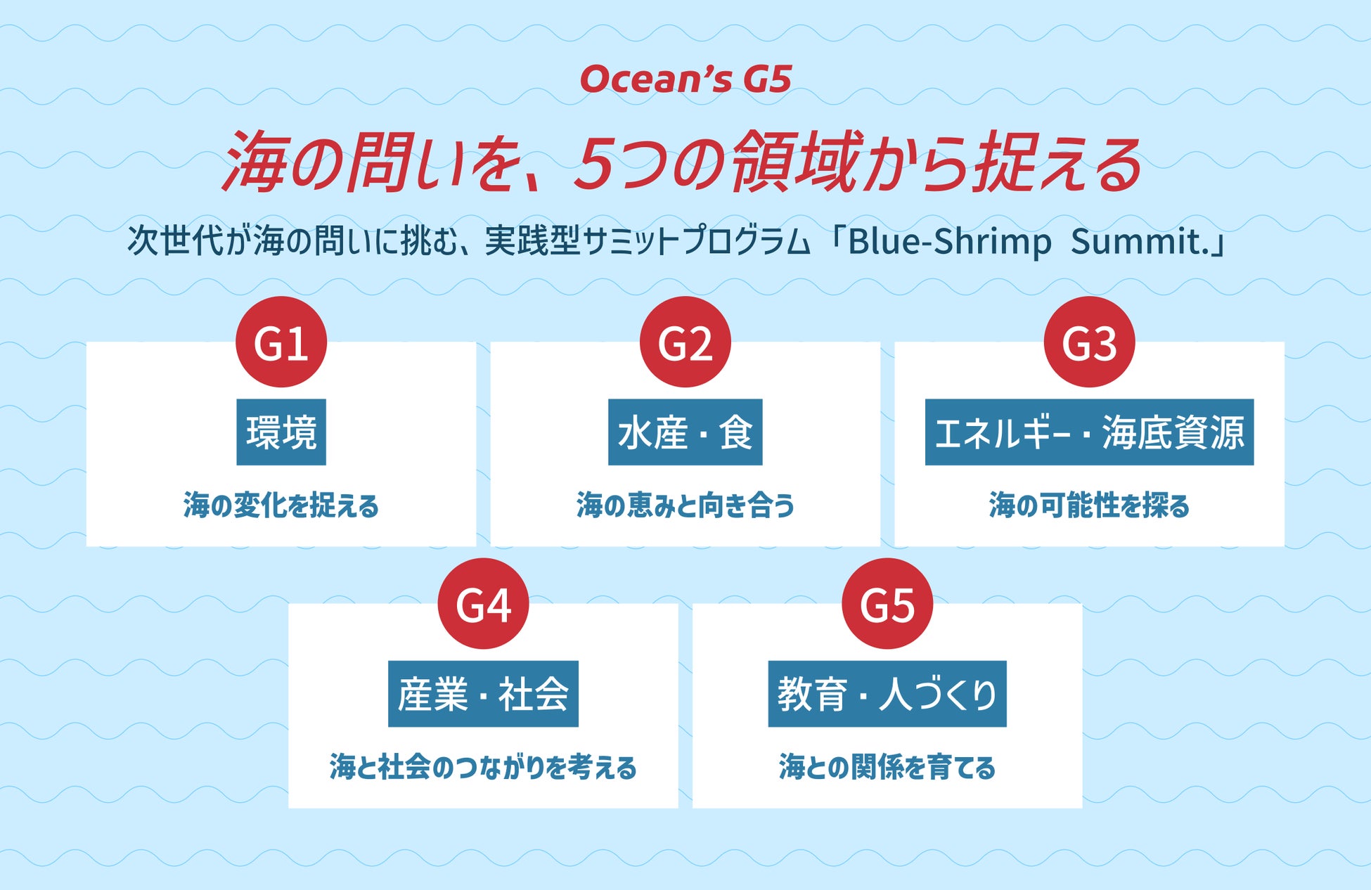 選抜された5チームが“海のG5(Ocean’s G5)”として集い、海の専門家も含めた対話と議論を通じて、ひとつの「Ocean Statement」を導き出します。 |
