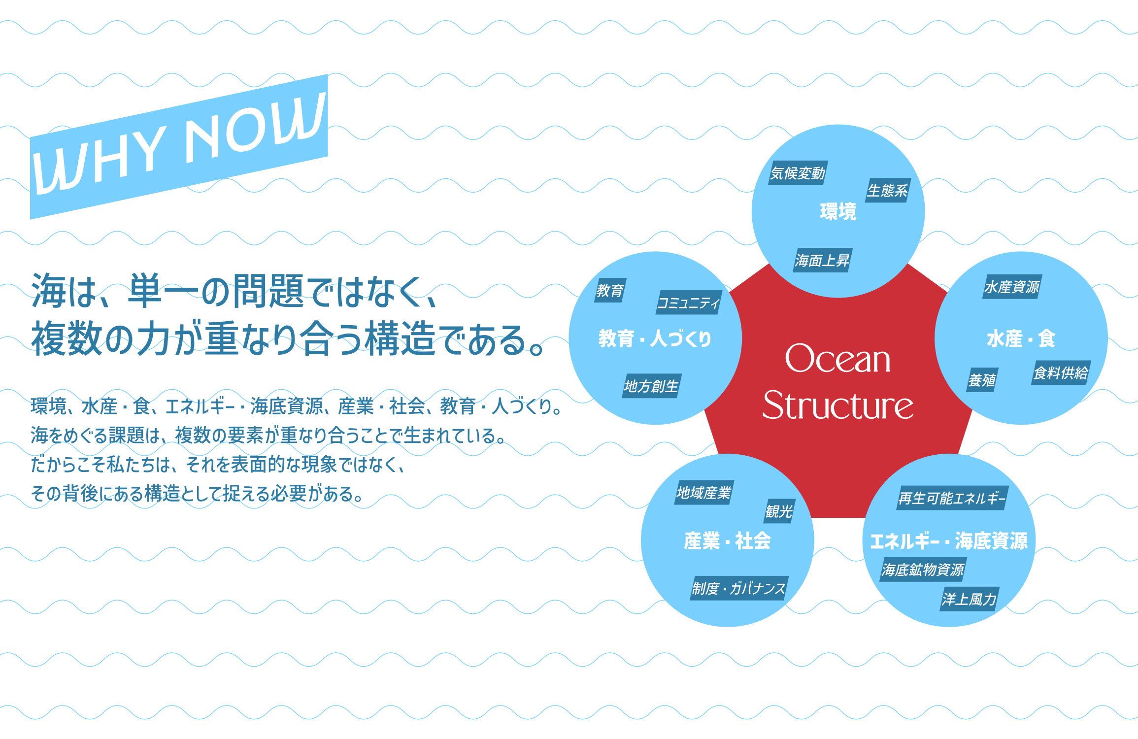 海をめぐる課題は、さまざまな要素が複雑で多層的に絡み合っています。海は単一の問題ではなく、環境・資源・産業・社会・制度など、複数の力が重なり合う構造として存在しています。