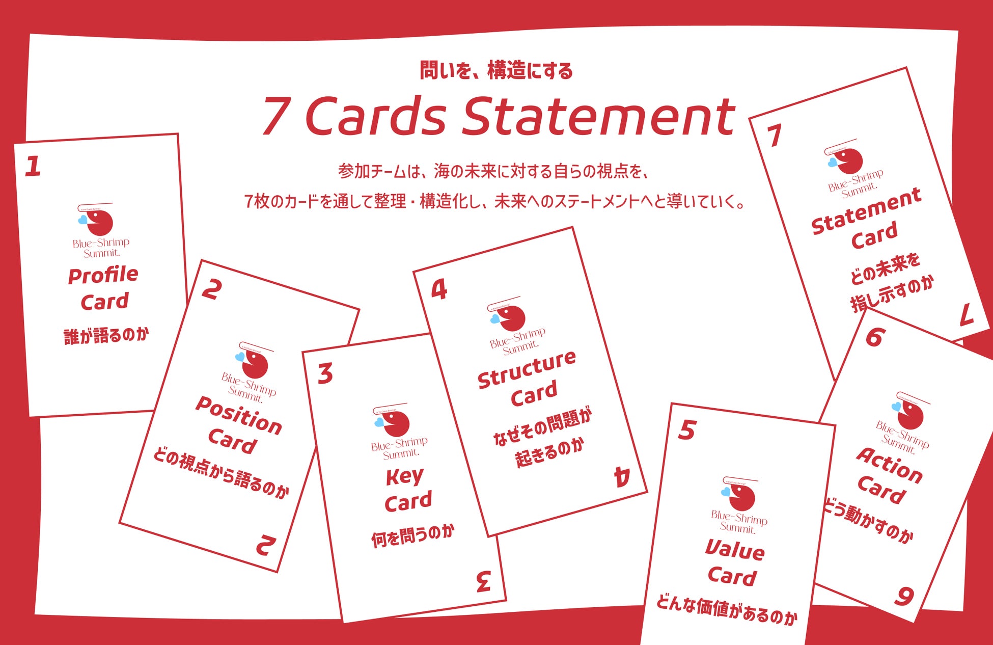 本プログラムでは、まず問題提起そのものを参加者自身が行い、その問いを、「7 Cards Statement」という独自のフレームワークに沿って、整理していきます。