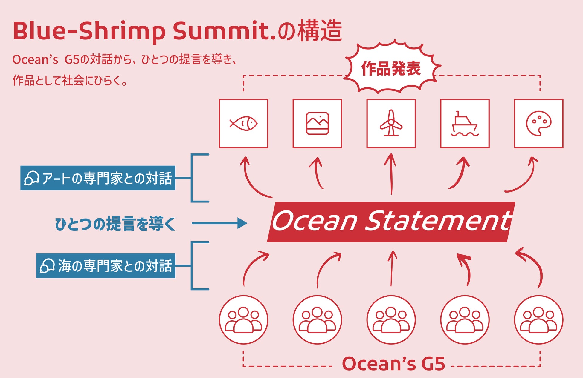 専門家による選考を経て選抜された5チームは、海にまつわる5つの領域を代表する“G5(Group 5)”として選出され、それぞれの視点を代表し、議論を重ね、海の専門家およびアートの専門家との対話を通して、未来に向けた"提言の策定"と"作品発表"を行います。
