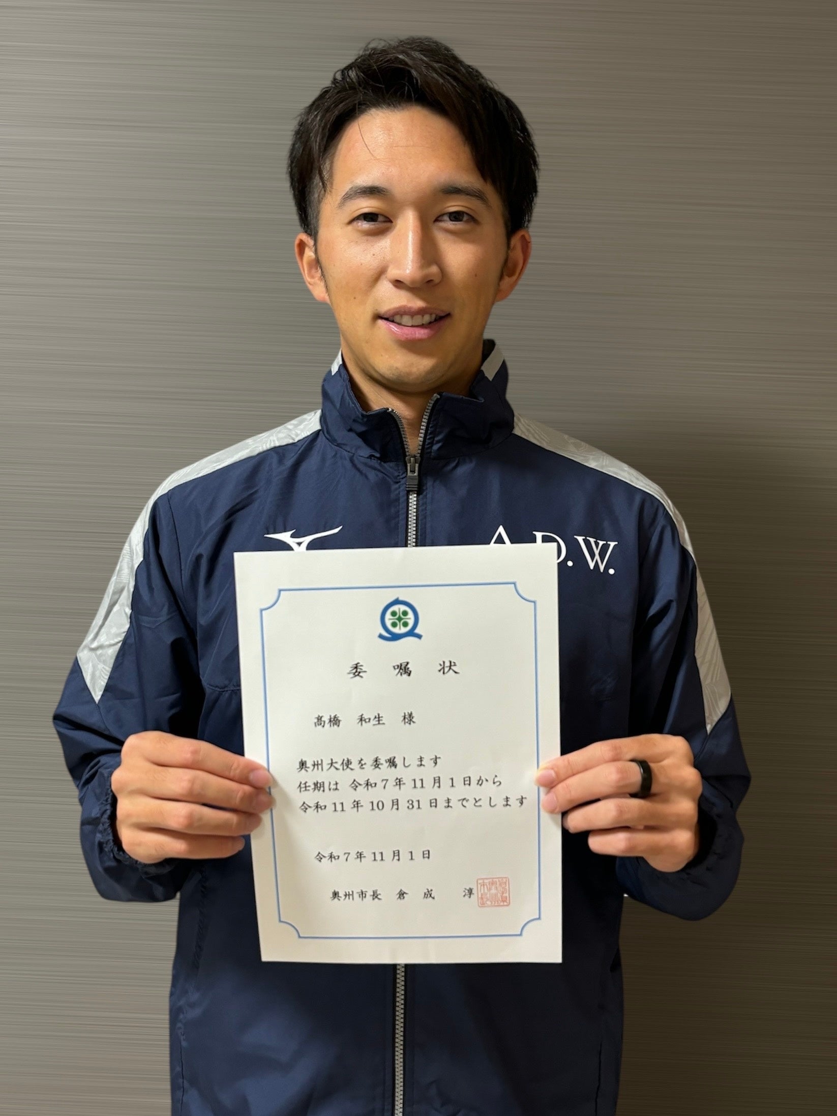 髙橋選手は、競歩を始めた地でもある奥州市のスポーツ関連事業にも積極的に協力しており、これまでの大会成績による高い注目度や継続的な地域への貢献により、この度奥州市「奥州大使」に就任いたしました。