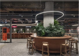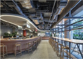西館ストリート・フードコート「P.」の計画は、かつてラグジュアリーブランドが並んでいたエリアを地域に開かれた場所へ変革させたプロジェクトです。店内中央に設けた大きなカウンターは4店舗の「P.friends」がシェアします。