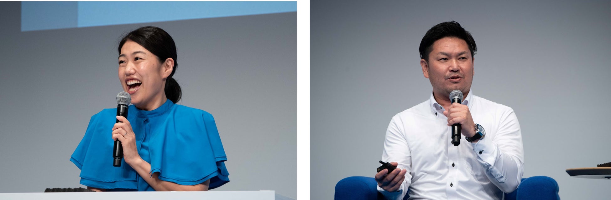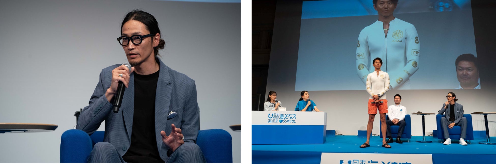 また、muta JAPAN株式会社の内海さんは「ライフジャケットは『ダサい』『汚い』というイメージがありましたが、“安全=かっこいい”をキーワードに、着たくなるフローティングアイテムを開発しています」と、ご自身のスーツも海辺で着れるかっこいいアイテムであることを例に紹介。同社のモデルである仁枝さんにも実際に浮力のあるアイテムを着ていただき、会場で披露しました。それを見た横澤さんは「かっこいい〜!海の男って感じ!」とスタイリッシュなアイテムに感動した様子でした。