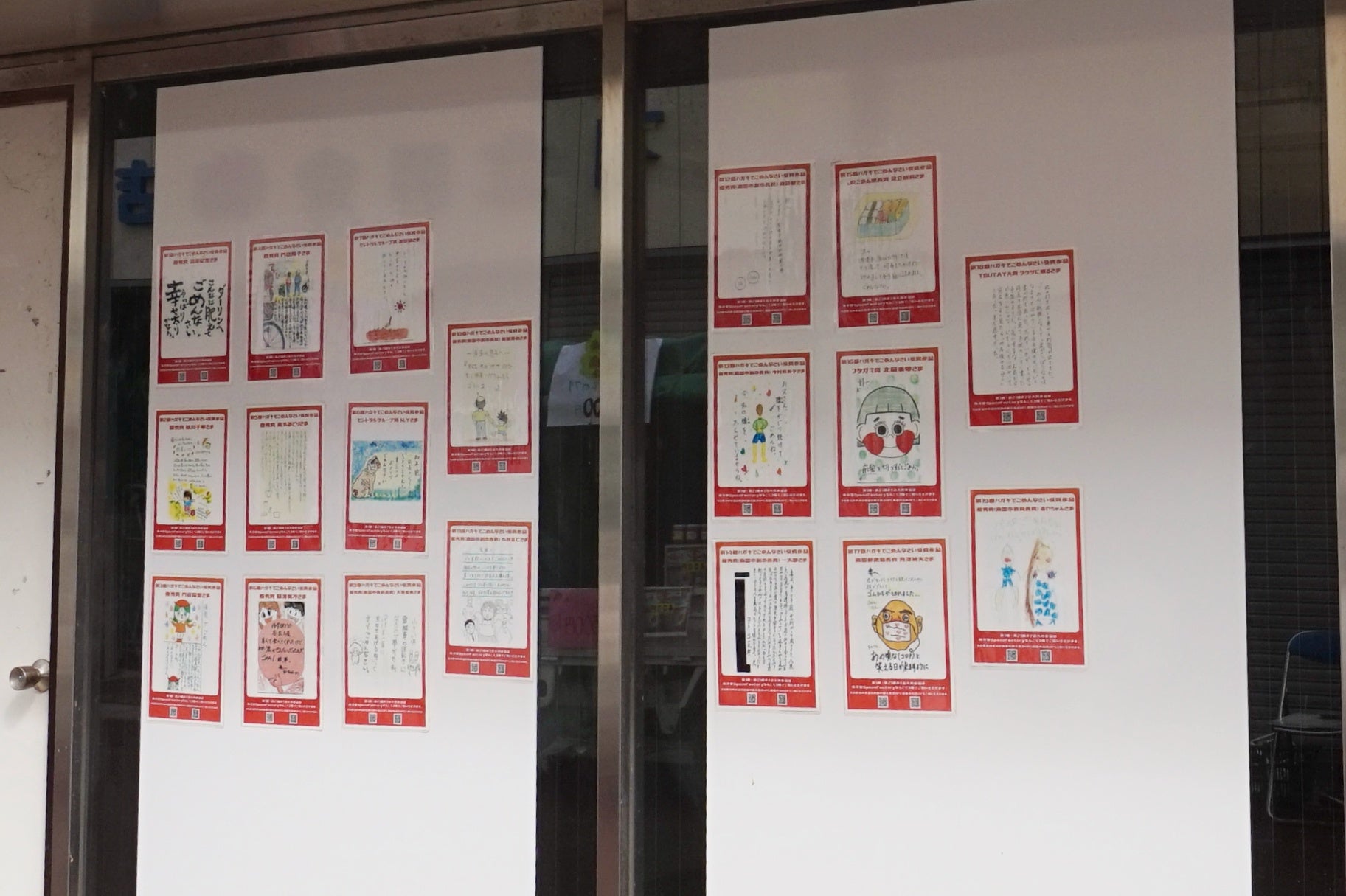 店舗のガラスなどを使って展示されているのは、やなせたかしさんが発案した「ハガキでごめんなさい全国コンクール」の歴代受賞作品。