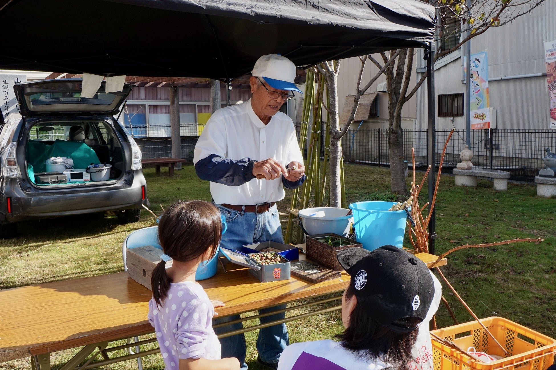 物販の他にも、枝や木の実など身近にある自然を使って笛やコマをつくる昔遊びコーナーや、プレゼントがもらえる子ども限定のスタンプラリーなども展開。