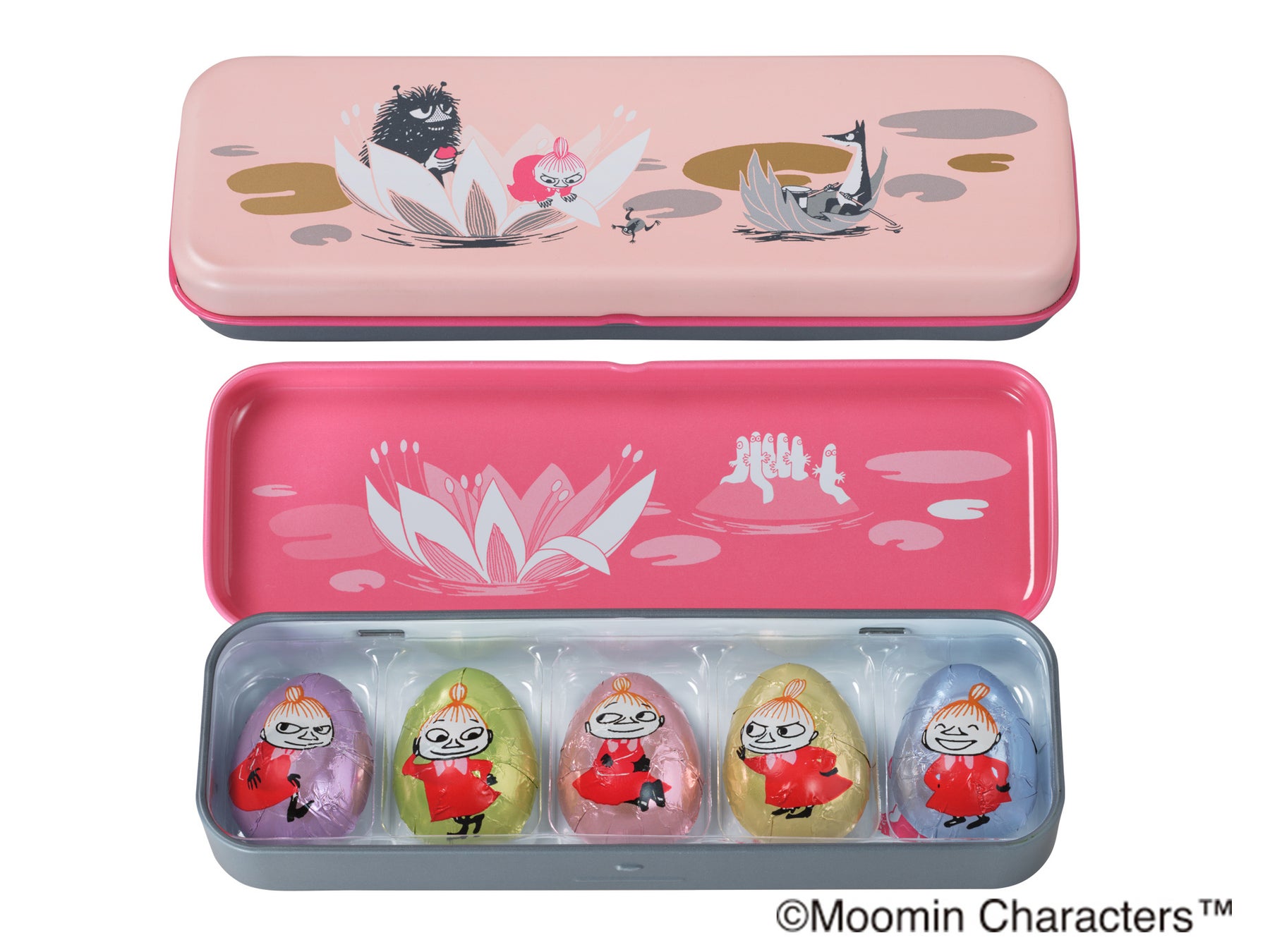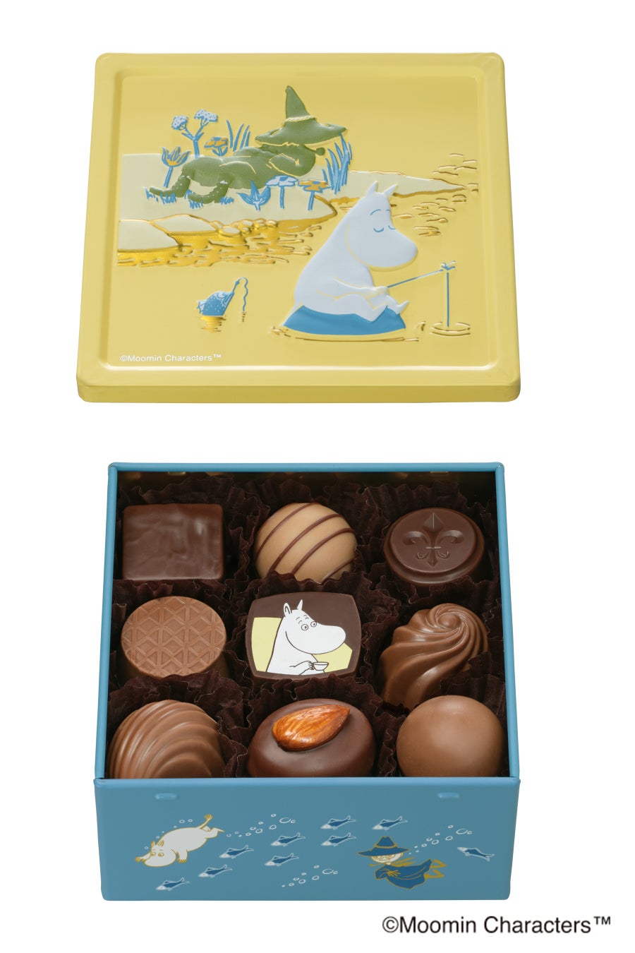 ムーミンたちが森の中でのんびりとした時間を過ごしている様子を描いた缶に、ニョロニョロやムーミンなどのチョコレートを詰め合わせました。