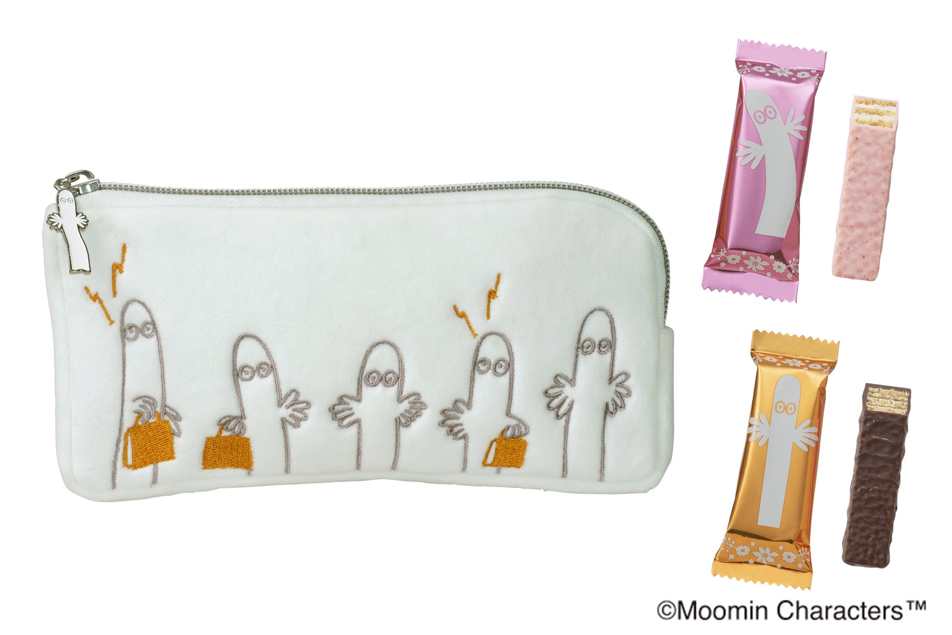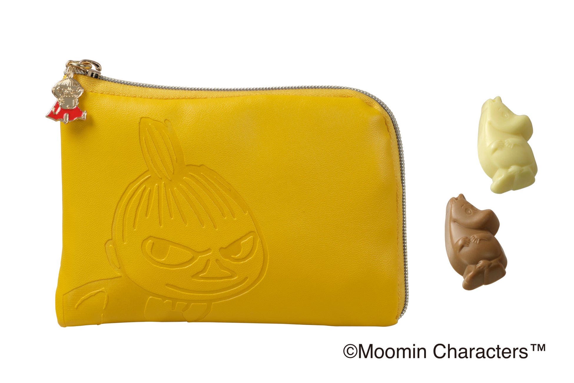 ムーミンの形をしたハイミルクチョコレートとホワイトチョコレートが入った、食べた後も楽しみなポーチです。