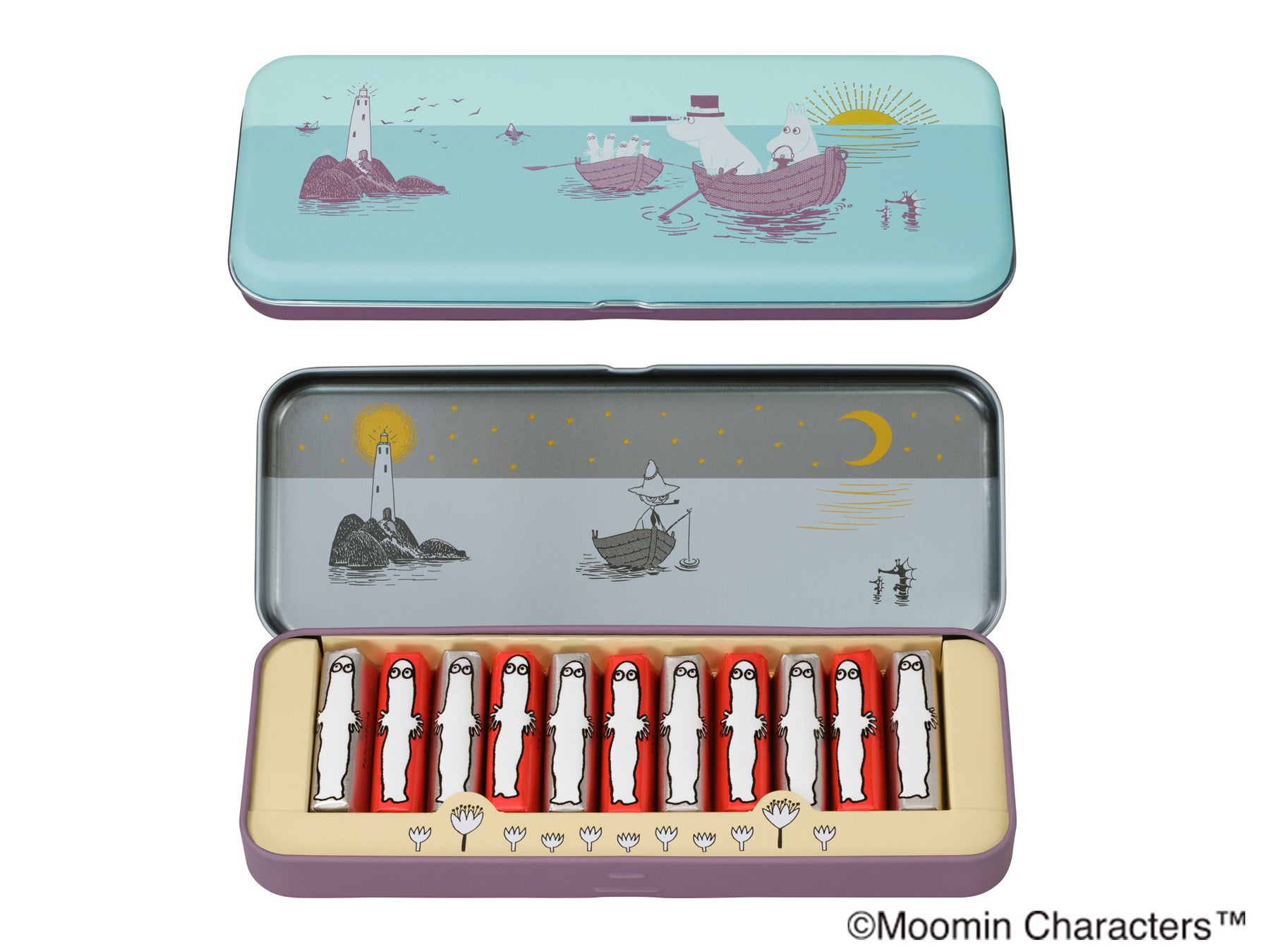 ムーミンの仲間たちがのんびりと過ごす姿を描いた缶ケースは上部の蓋と、側面にも扉がついていて開けることが出来る特別仕様。