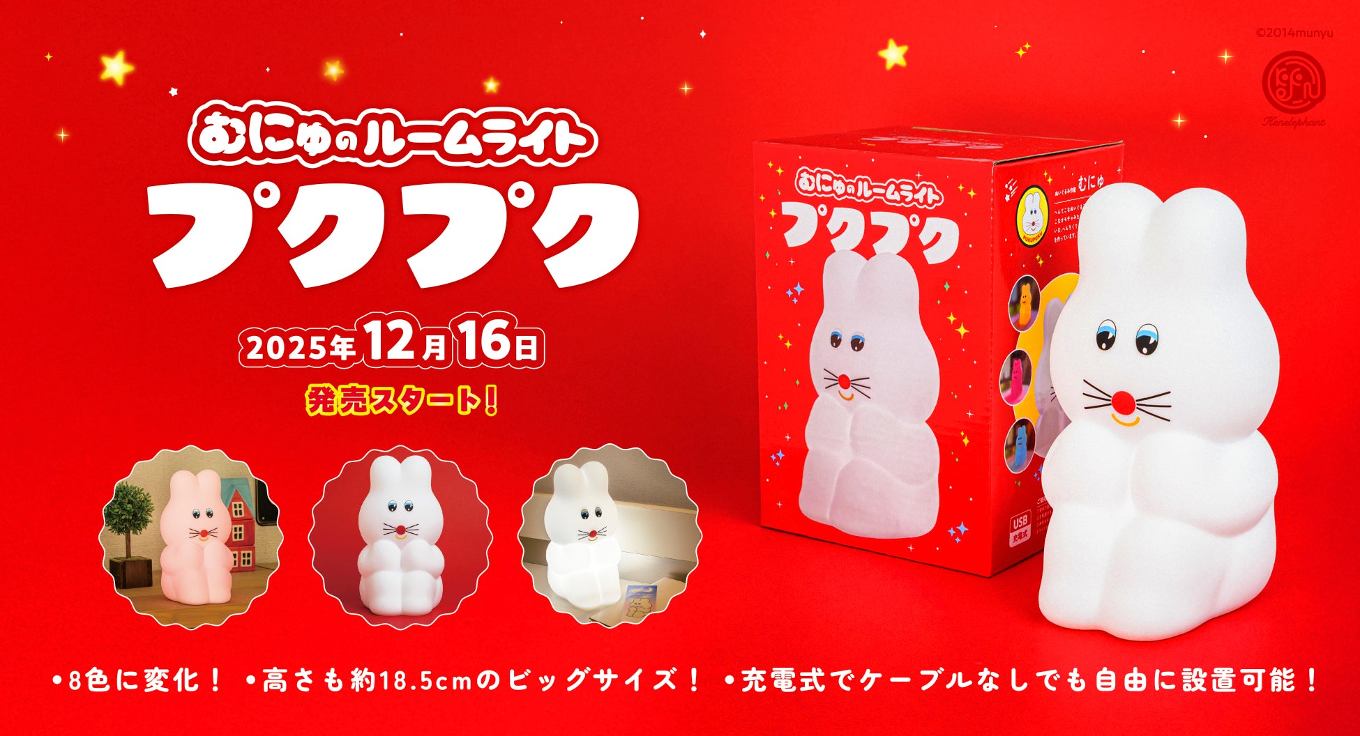 アート雑貨メーカーの株式会社ケンエレファント(本社:東京都千代田区、代表取締役社長:石山健三)は、ぬいぐるみ作家・むにゅさんとのコラボレーションによる自社初のルームライト『むにゅのルームライト プクプク』を、2025年12月16日(火)に発売いたします。