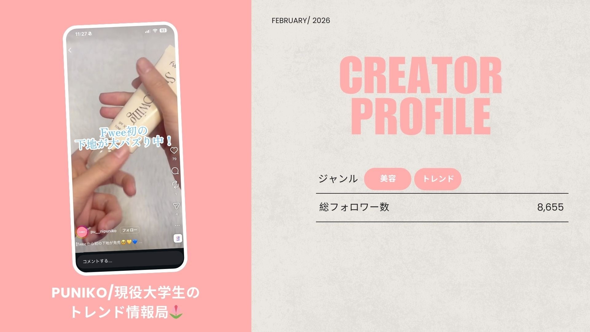 「PUNIKO/現役大学生のトレンド情報局🌷」は、コスメや新商品を中心に取材を行い、動画の制作・発信をしています。これまでの投稿の中には、再生回数8万回を超える動画も。美容やトレンド分野に強みを持つ同メディアの加盟により、若年層に向けたトレンド情報の認知拡大および話題化創出が期待されます。