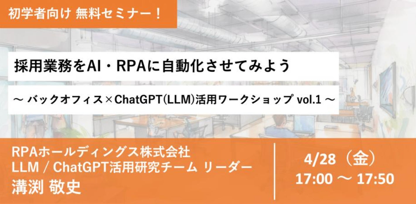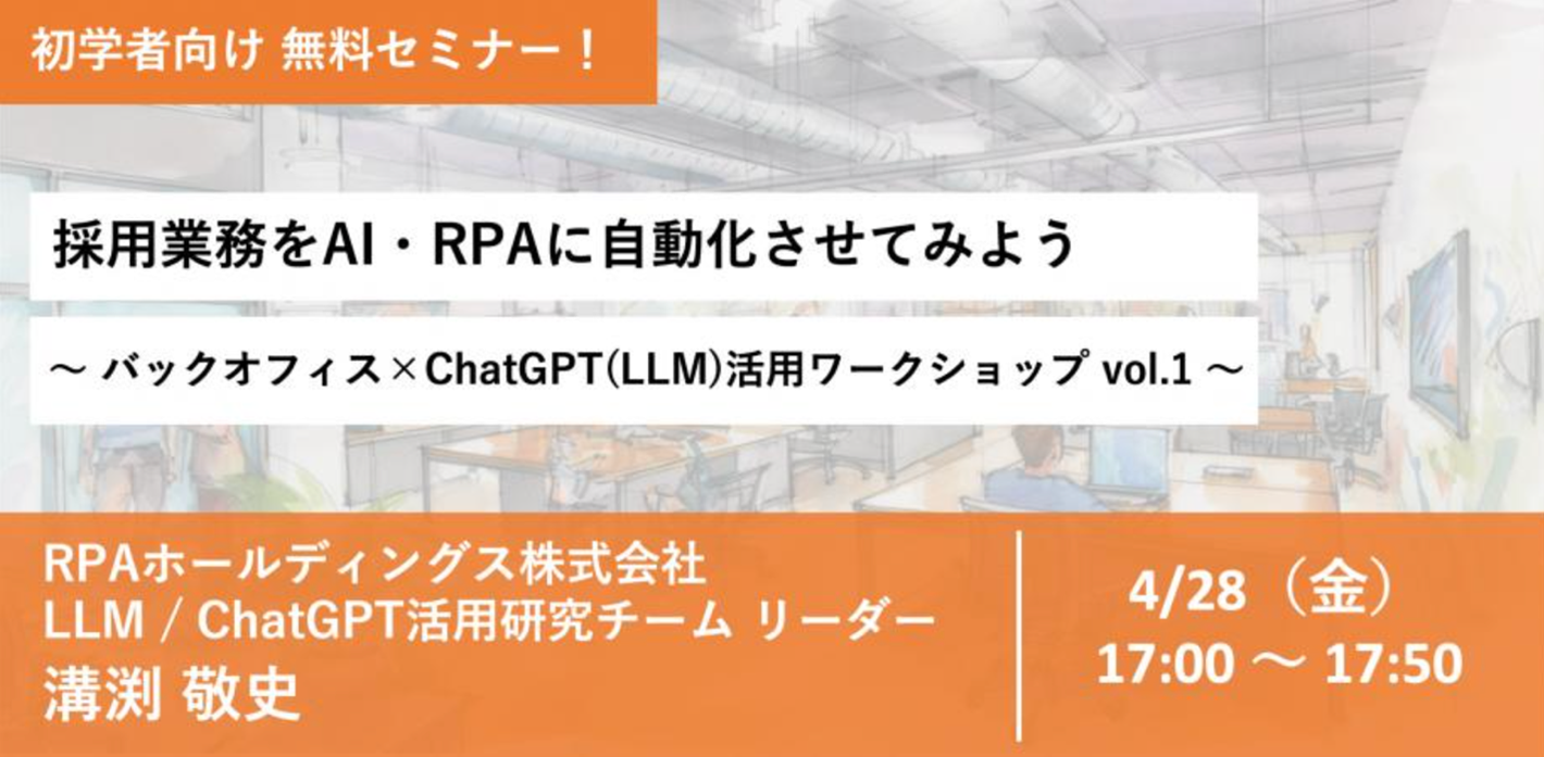 RPAホールディングス(本社:東京都港区、代表取締役:高橋 知道、以下「RPAホールディングス」)は、無料のオンラインセミナー「【無料・初学者向け】採用業務をAI・RPAに自動化させてみよう~バックオフィス×ChatGPTワークショップ vol.1~」を開催致します。