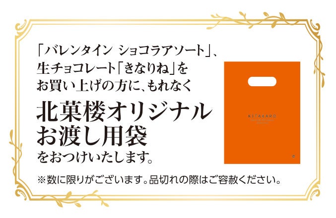 「バレンタインショコラアソート」「生チョコレートきなりね」をお買い上げの方に、北菓楼オリジナルお渡し用袋を無料でおつけいたします。