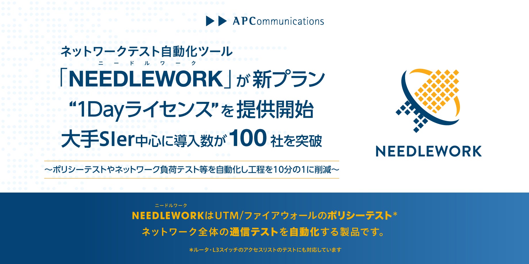 株式会社エーピーコミュニケーションズ(本社:東京都千代田区、代表取締役:内田武志、以下「当社」)は、この度、ネットワークテスト・ポリシーテスト自動化ツール「NEEDLEWORK(ニードルワーク)」の新プラン「1Dayライセンス」の提供を開始しました。さらに、売上や導入数も順調に伸びており、2025年1月時点で導入数は100社を突破しました。
