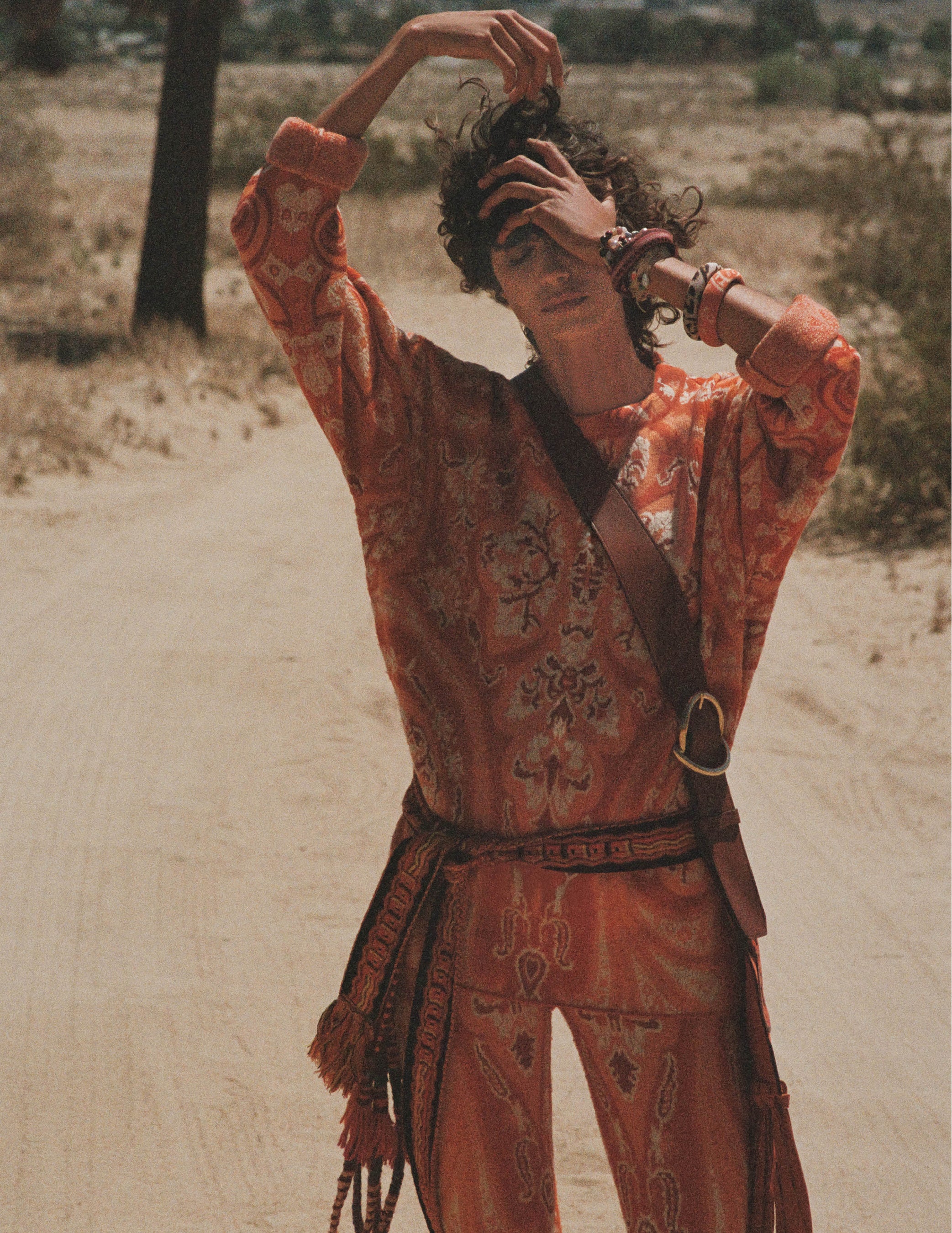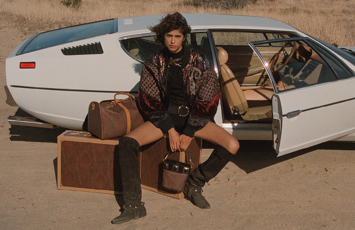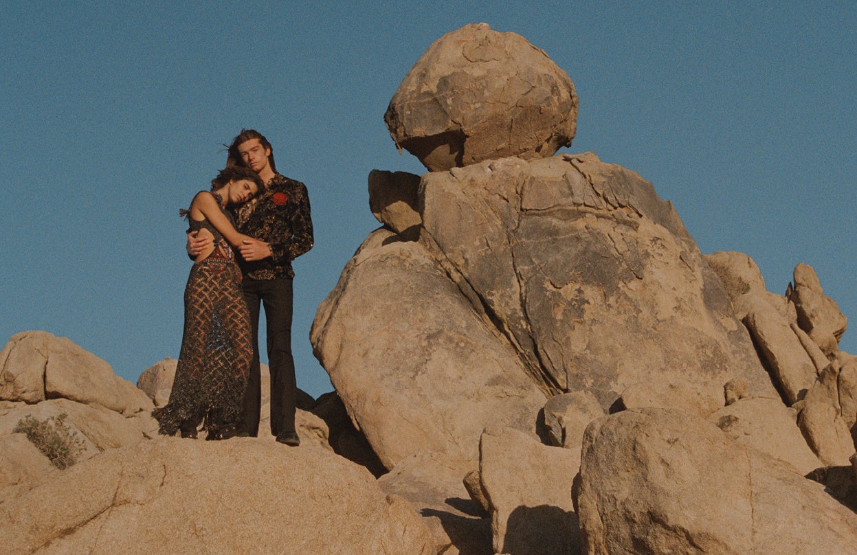 都会を離れ、コルベットに乗り旅を続けるミカ・アルガナラズとサム・マロスの二人が辿り 着いたのは砂漠。人は権威も成す術もなく、ただ自然が野生の威力を振るう世界で、かつての理想主義と繋がりを匂わせる服を身に纏い、岩と砂煙の間を移動します。キャンペーンイメージには、精緻なディテールから、ワイルドに仕上げた上質な素材まで、エトロのアイデンティティであるノマド・スピリットが、時間や空間などの概念に囚われずにしっかりと表現されています。過去なのか未来なのか、既に起こったことなのか、それとも、これから起ころうとしていることなのか?それを明らかにしたり、整理したりするのは無意味。重要なのはそこから発せられる平和です。夕刻の灼熱の太陽に照らされ、強い願望が浮き彫りになった平穏と安らぎのメッセージ。