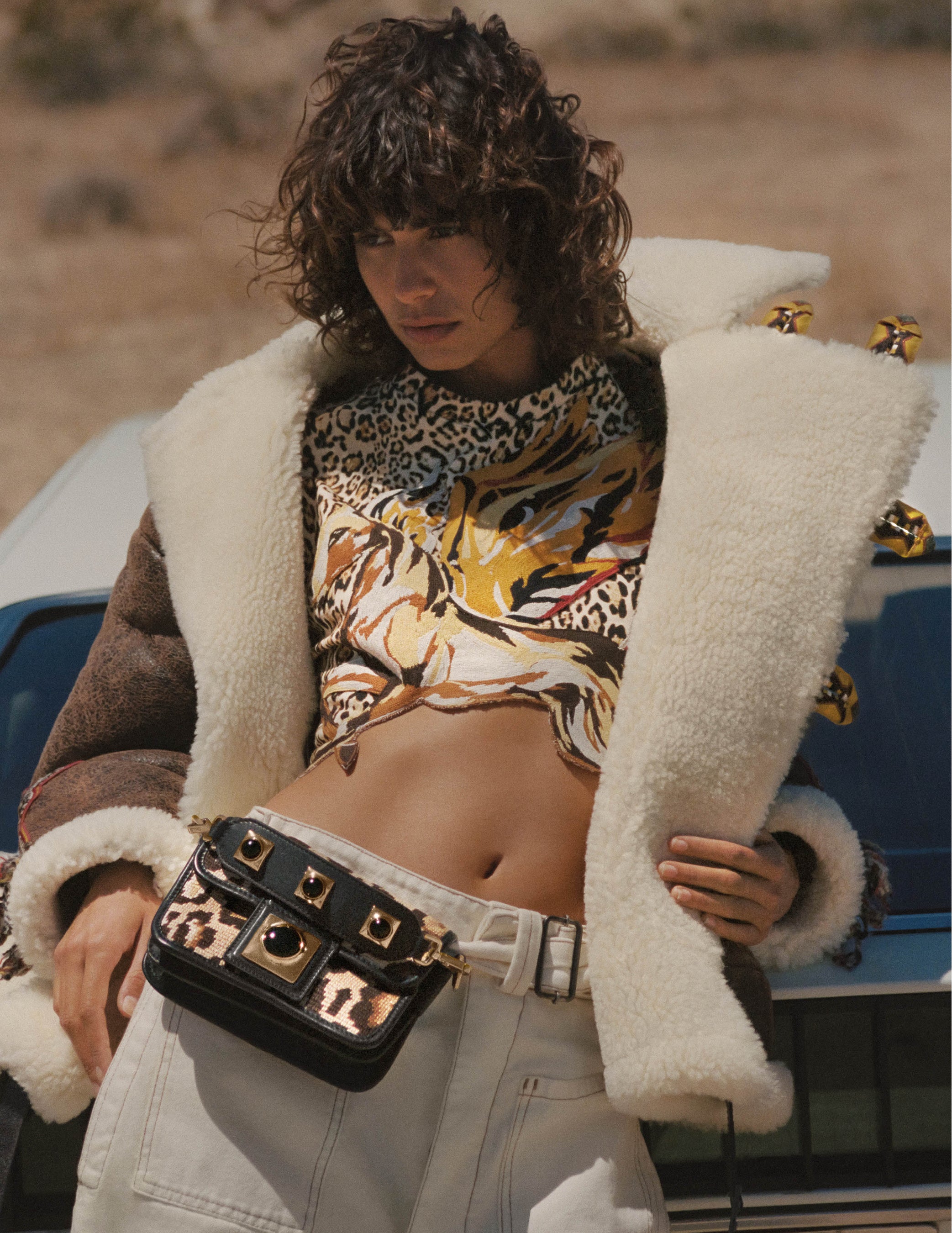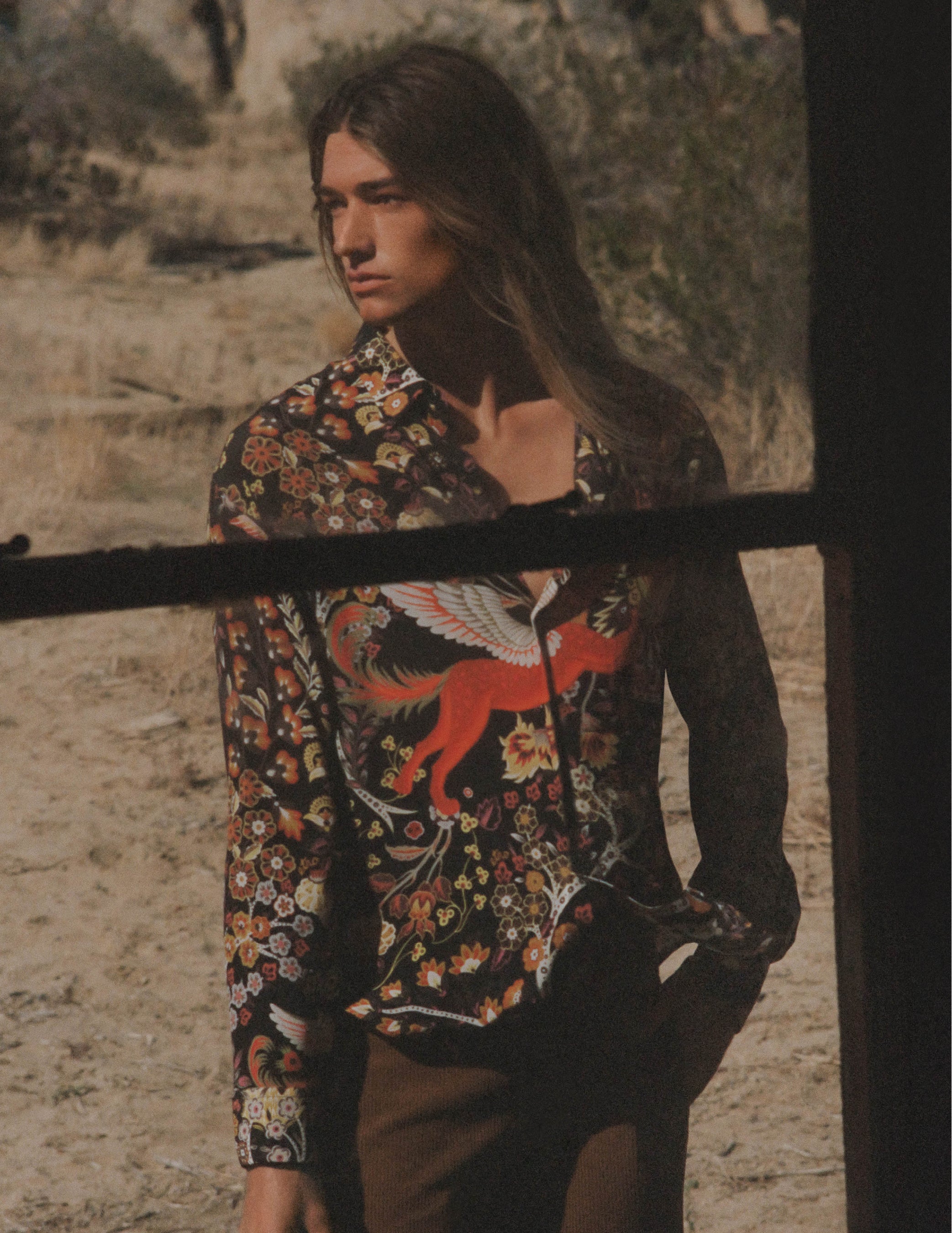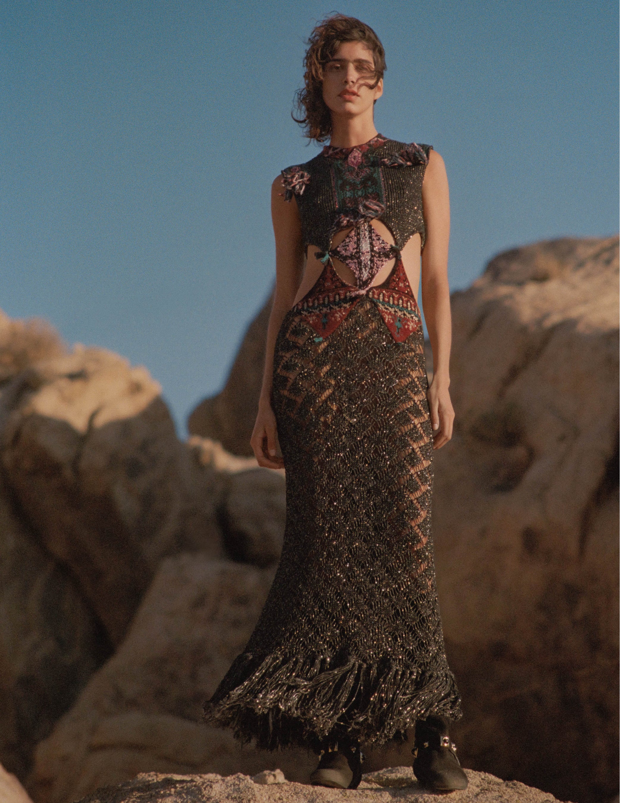 都会を離れ、コルベットに乗り旅を続けるミカ・アルガナラズとサム・マロスの二人が辿り 着いたのは砂漠。人は権威も成す術もなく、ただ自然が野生の威力を振るう世界で、かつての理想主義と繋がりを匂わせる服を身に纏い、岩と砂煙の間を移動します。キャンペーンイメージには、精緻なディテールから、ワイルドに仕上げた上質な素材まで、エトロのアイデンティティであるノマド・スピリットが、時間や空間などの概念に囚われずにしっかりと表現されています。過去なのか未来なのか、既に起こったことなのか、それとも、これから起ころうとしていることなのか?それを明らかにしたり、整理したりするのは無意味。重要なのはそこから発せられる平和です。夕刻の灼熱の太陽に照らされ、強い願望が浮き彫りになった平穏と安らぎのメッセージ。