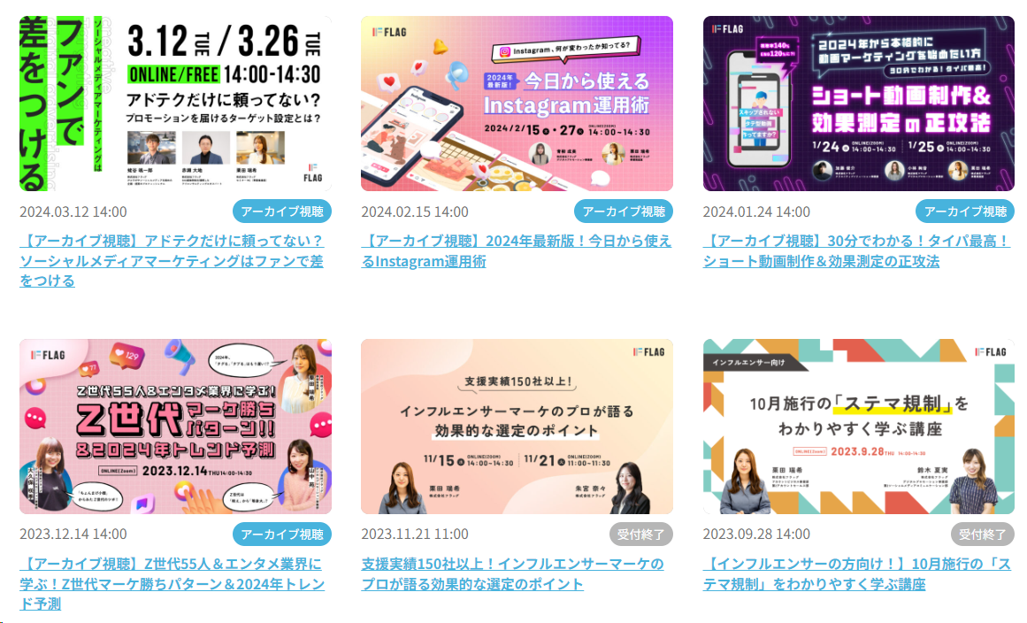 フラッグは最新のソーシャルメディアマーケティングの最新事例、ソーシャルメディアの活用方法などを中心に、マーケティング・プロモーション担当者の方々に向けの無料セミナーを定期開催しています。