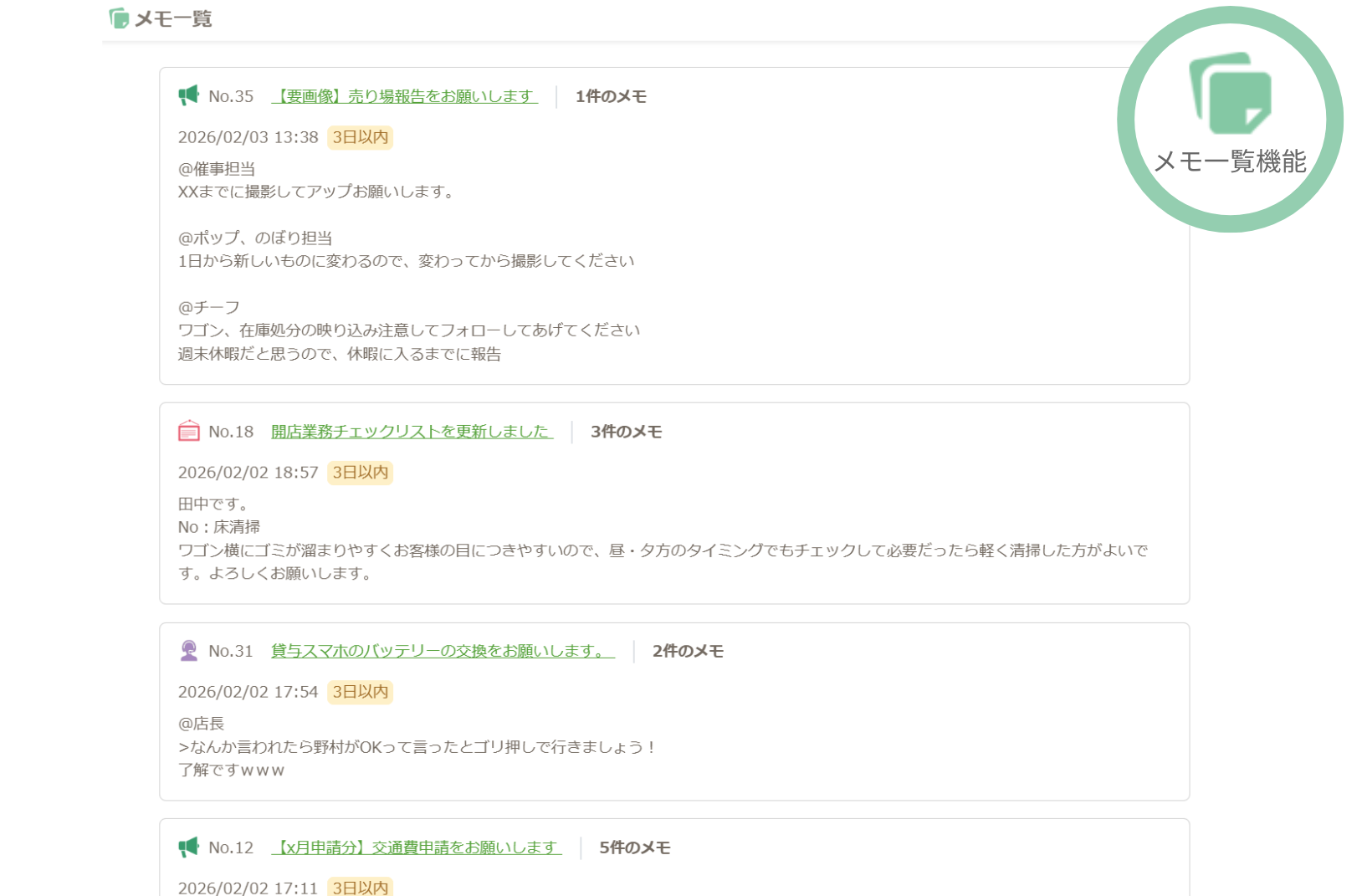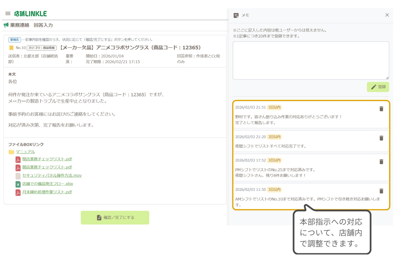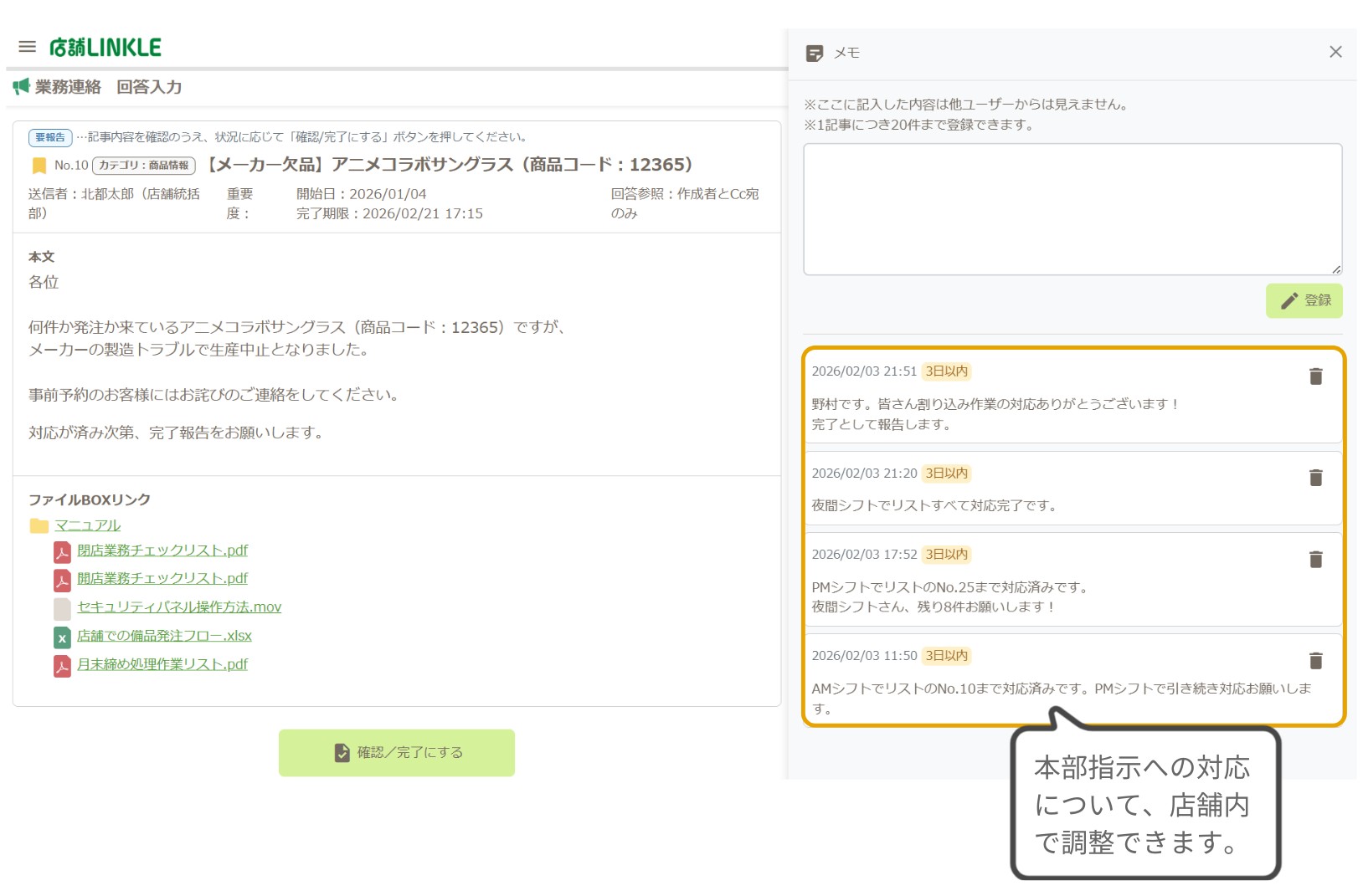 本機能により、本部からの指示に対して「誰が担当するか」や「回覧済み」などのメモを残せるようになり、店舗内の細かな調整が円滑になります。