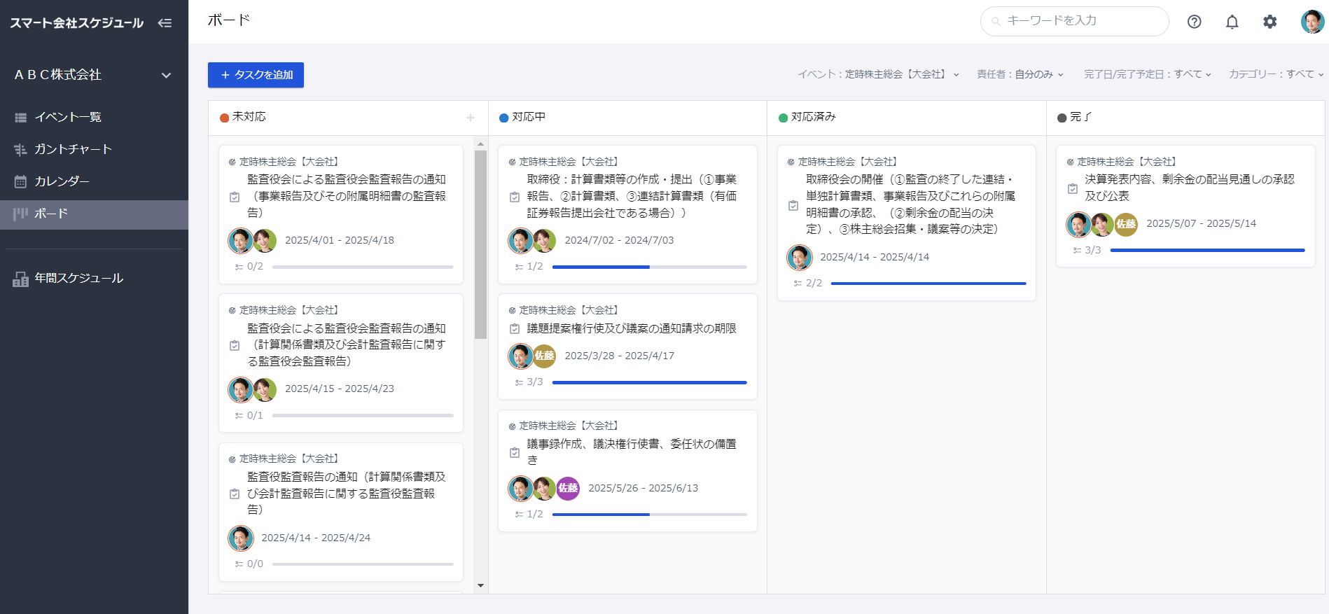 イベントごとにタスクの進捗や法定期限・期日の確認ができます。