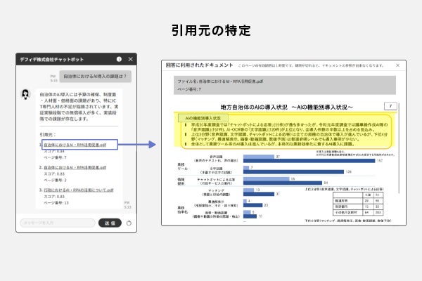 情報の即時抽出: 質問や検索に対し、要約回答とともに、情報源となるドキュメントをハイライト表示し、必要な情報の所在を瞬時に特定します。