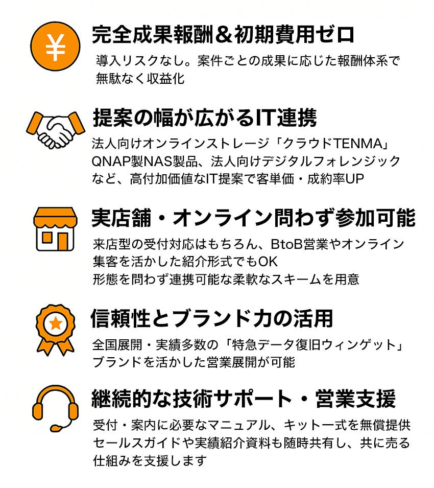 貴社の強みと地域性を活かしながら、データ復旧という“緊急かつ重要なニーズ”に応えるパートナーシップを築きませんか?