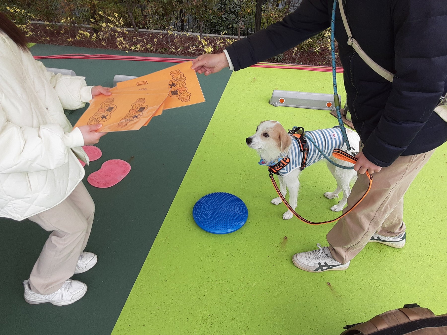 スタッフの持つカードから、3枚引いて書かれているコマンドが出来たらカードを捨てられる。ワンちゃんと協力して完全制覇を目指してください!