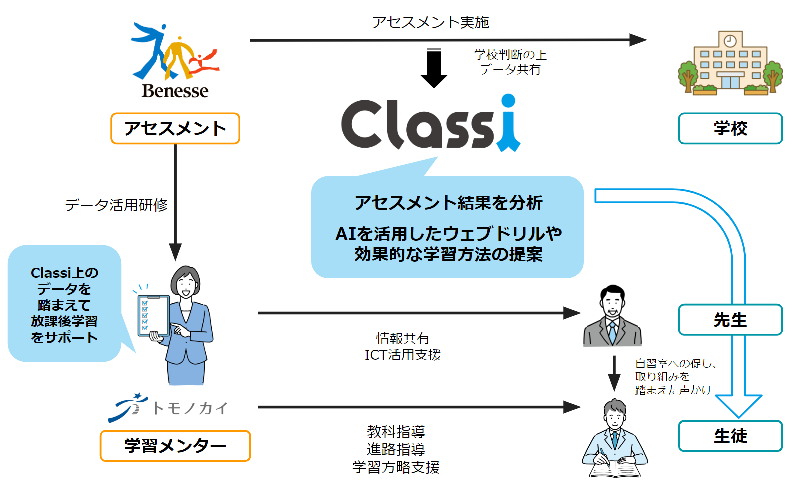 ベネッセが提供するアセスメントを元に、Classi上で学習データを蓄積、個別最適化されたウェブドリル(AIレコメンド演習)を提供します。これらの学習データやウェブドリルを活用しながら、放課後学習においてトモノカイが派遣する大学生メンターが生徒の特性や学力層別に合わせた指導を行います。