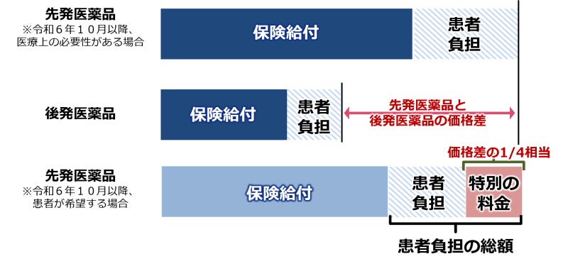 2024年10月1日より、医療機関や調剤薬局において、後発医薬品(ジェネリック医薬品)が存在する処方薬について、患者が特段の医療上の理由がないにもかかわらず先発医薬品(長期収載品)を希望する場合、通常の医療費負担に加えて先発品と後発品の価格差の一部を「選定療養費」として自己負担する制度が開始されました。