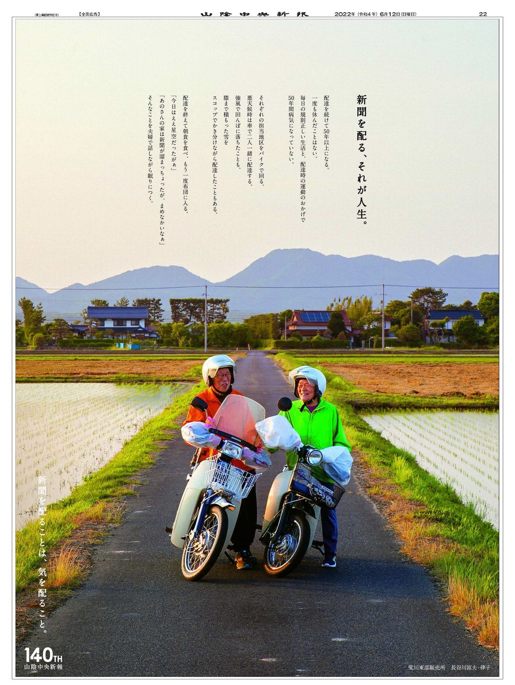 2022年に創刊140周年を迎えた同社は、新聞が届くという日常の裏側には、配達員の見えざる配慮と努力があることを広く知ってもらおうと配達員にスポットを当てたプロモーションを企画。人の目に触れにくい早朝に配達する彼らの細やかな気配りや配達にかける思いを聞き取り、過度な表現は避けた実直な内容を広告として表現した。大きな反響があり、配達員への激励や感謝のメッセージが多数寄せられ、また配達員からも「自らの仕事を誇りたい」という前向きな発言が上がった。デジタル化の進展やコロナ禍での分断も相まって、人同士のつながりが希薄になっているという指摘がある中で、人の手で日々新聞を届けるという行為がどのような価値を持つのか、地域に問いかけることができたキャンペーンとなった。