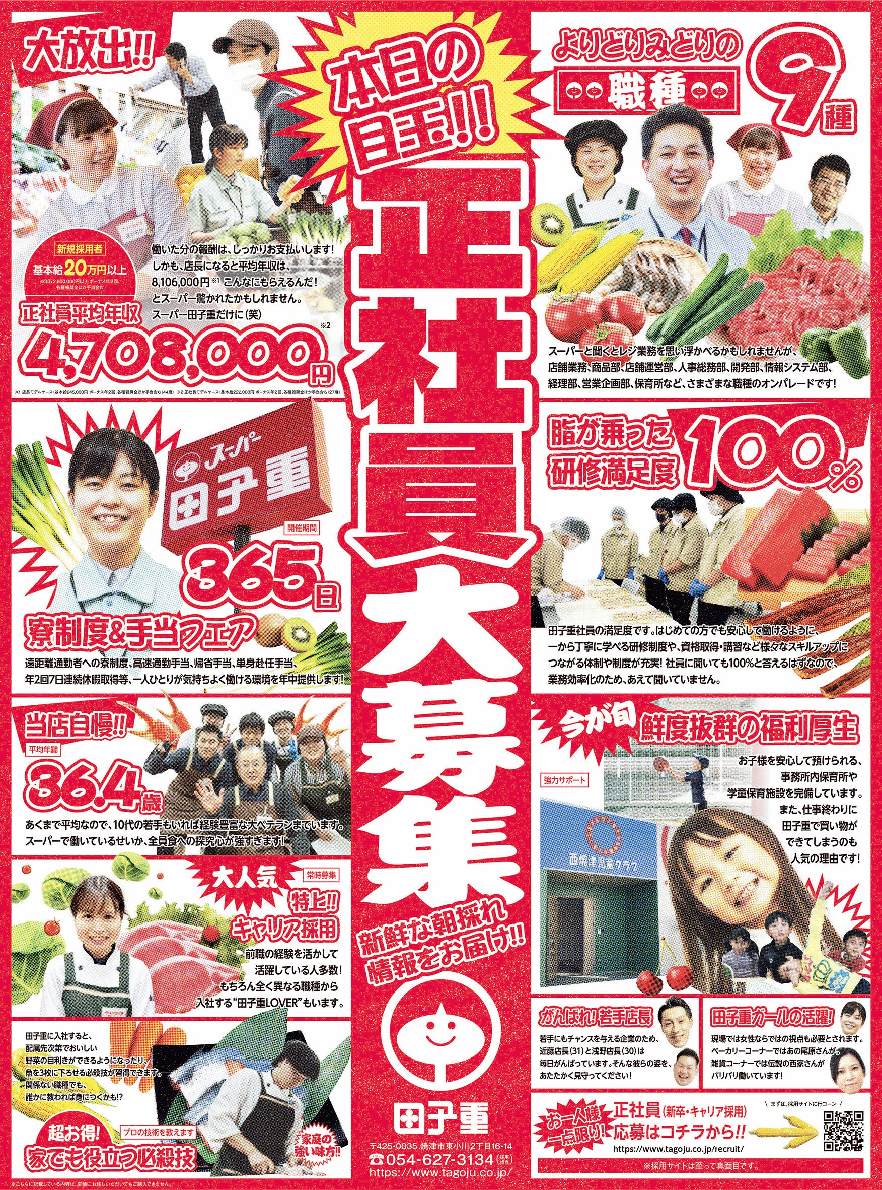 正社員募集をより広域に告知するため、新聞広告を出稿。スーパーには多様な職種があることや、手厚い福利厚生などの知られざる魅力を伝えることを目指した。朝刊という朝に届くメディアであることを活かし、「朝採れ情報」というキーワードで特売のチラシのように見せつつ、記事の面白さにひかれて読んでいくと実は正社員募集であることが伝わる構成とした。新聞の紙質を活かしてチラシらしく見せるために、あえて解像度を粗くした写真や掠れたインクの雰囲気を作るなど、デザイン面にもこだわって制作した。直接社員募集に関係のない読者に対しても、企業イメージ向上につながる取り組みとなった。