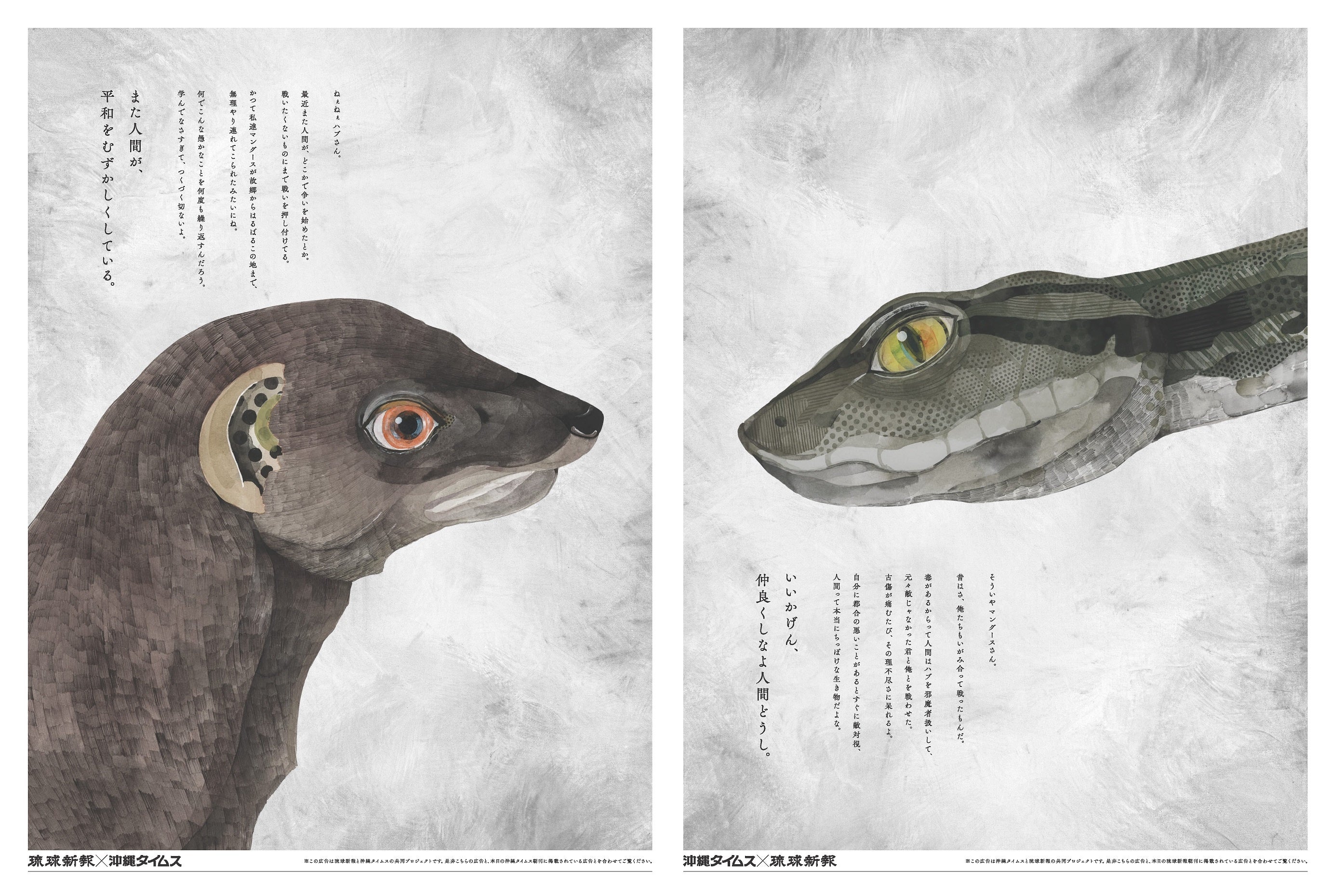 2022年5月、沖縄の本土復帰50周年の節目を記念して、ライバル新聞社2社が協力。「対立関係の象徴」とされるハブとマングースを反戦のモチーフとして、「争いをやめて平和な世界を目指そう」というメッセージ広告を紙上から発信した。ハブとマングースは本来生物学的な敵同士ではないが、人間によって対立させられ苦しめられた歴史があり、その二匹が現在の人間たちについて語り合う中に、人類が気づくべきメッセージがあるのでないかと問いかけている。掲載直後から大きな反響があり、各メディアに露出され、SNSでも意見の発信や議論が繰り広げられた。