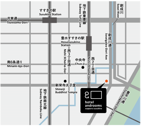 札幌市営地下鉄東冨線「豊水すすきの駅」から徒歩3分、札幌市営地下鉄南北線「すすきの駅」から徒歩9分に位置します。飲食店をはじめ、さまざまなショップが並ぶ、札幌の街の中心地にアクセスが良い便利なホテルです。