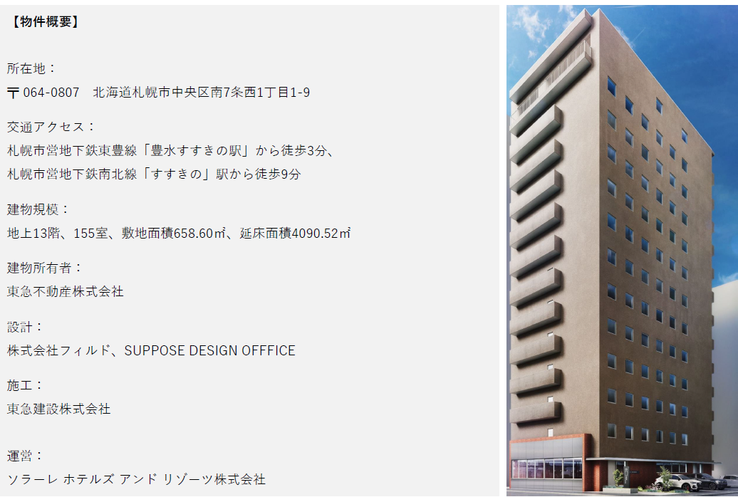 東急不動産株式会社(所在地:東京都渋谷区、代表取締役社長:岡田 正志)及び、ソラーレ ホテルズ アンド リゾーツ株式会社(所在地:東京都港区、代表取締役社長:井上 理、以下ソラーレホテルズ)は、『ホテル・アンドルームス札幌すすきの』を2022年夏に開業いたします。 『ホテル・アンドルームス札幌すすきの』は全155室からなる新築のホテルで、名古屋や京都、大阪にあるソラーレホテルズの「ホテル・アンドルームス」ブランドの7軒目となります。
