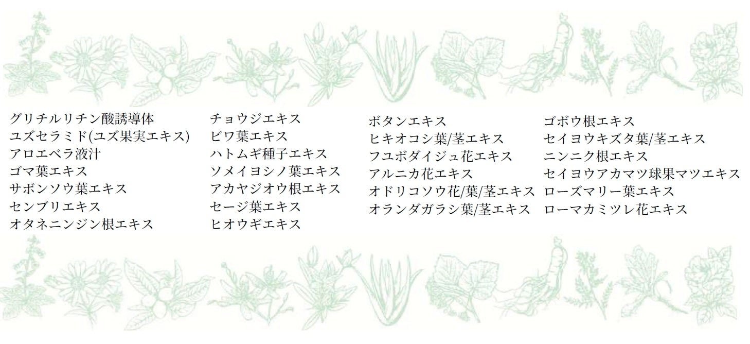 甘草由来「グリチルリチン酸誘導体」や「ユズセラミド」、「エゴマ葉エキス」、「アロエベラ液汁」など、26種