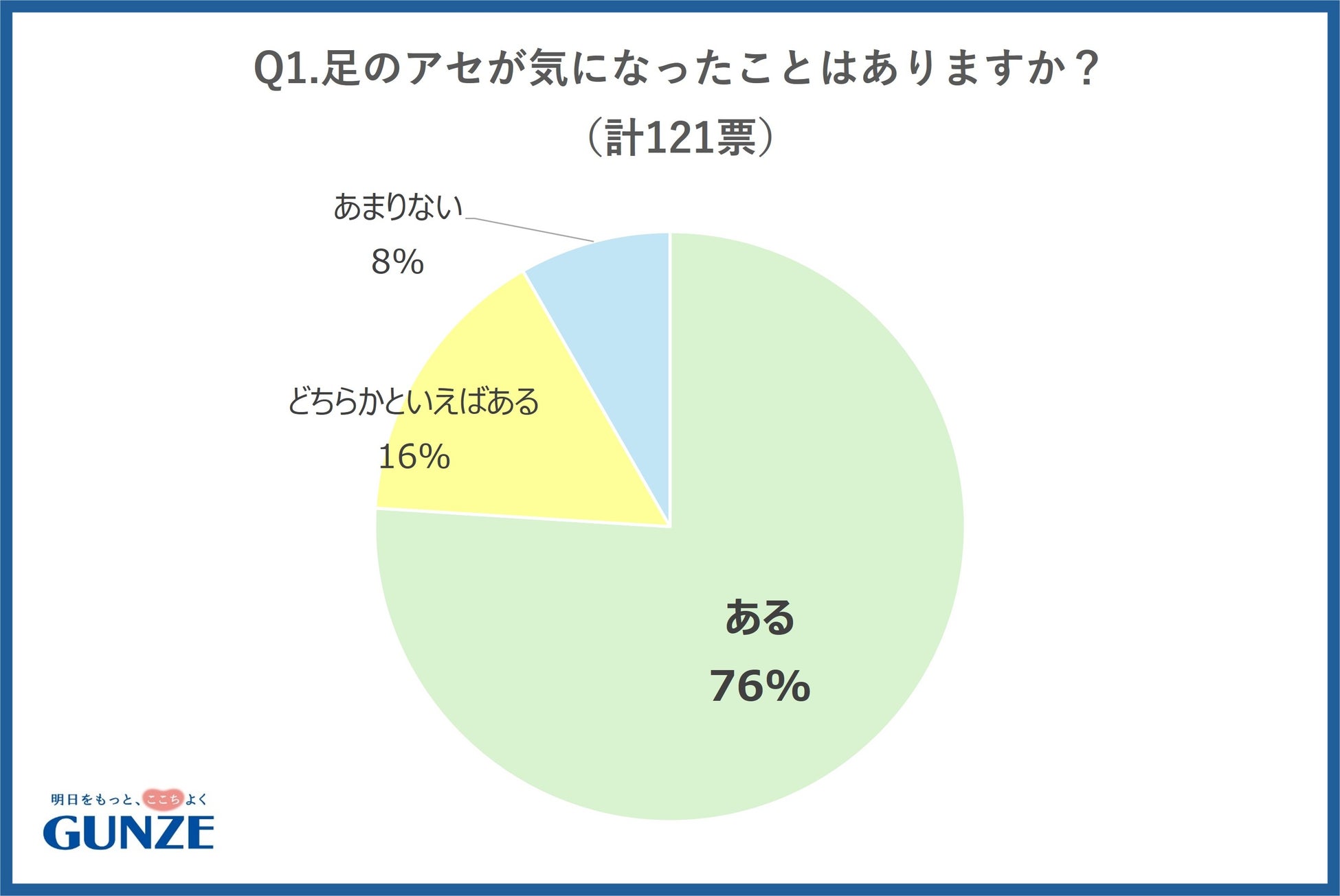 グンゼの公式Xを使用し、足のアセについてのアンケート調査を行いました。足のアセが気になる人は全体の76%と多く、特に夏に気になる人が83%という結果が出ました。足のアセによるムレが不快な方は49%、ニオイが36%という結果に。また、足のアセについて機能性の高い靴下で対策している人は42%で、通気性のよい靴や足の洗浄で対策している人もいるものの、それらの対策では効果を実感していない人の方が多い結果となりました。