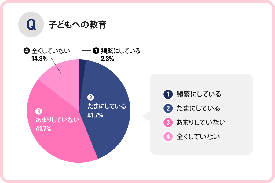 環境保護や持続可能な社会に対する子どもへの教育を行っているかの問いに対しては、「頻繁にしている」「たまにしている」が44%だった一方、「あまりしていない」「全くしていない」が56%という結果となり、教育をしていない家庭の方が多いことが分かりました。
