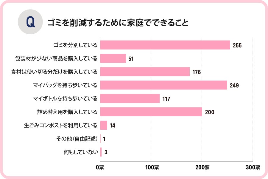 ゴミの削減のために家庭でできることは、「ゴミを分別している」が最も多く、続いて「マイバッグを持ち歩いている」が同程度に多い結果となりました。