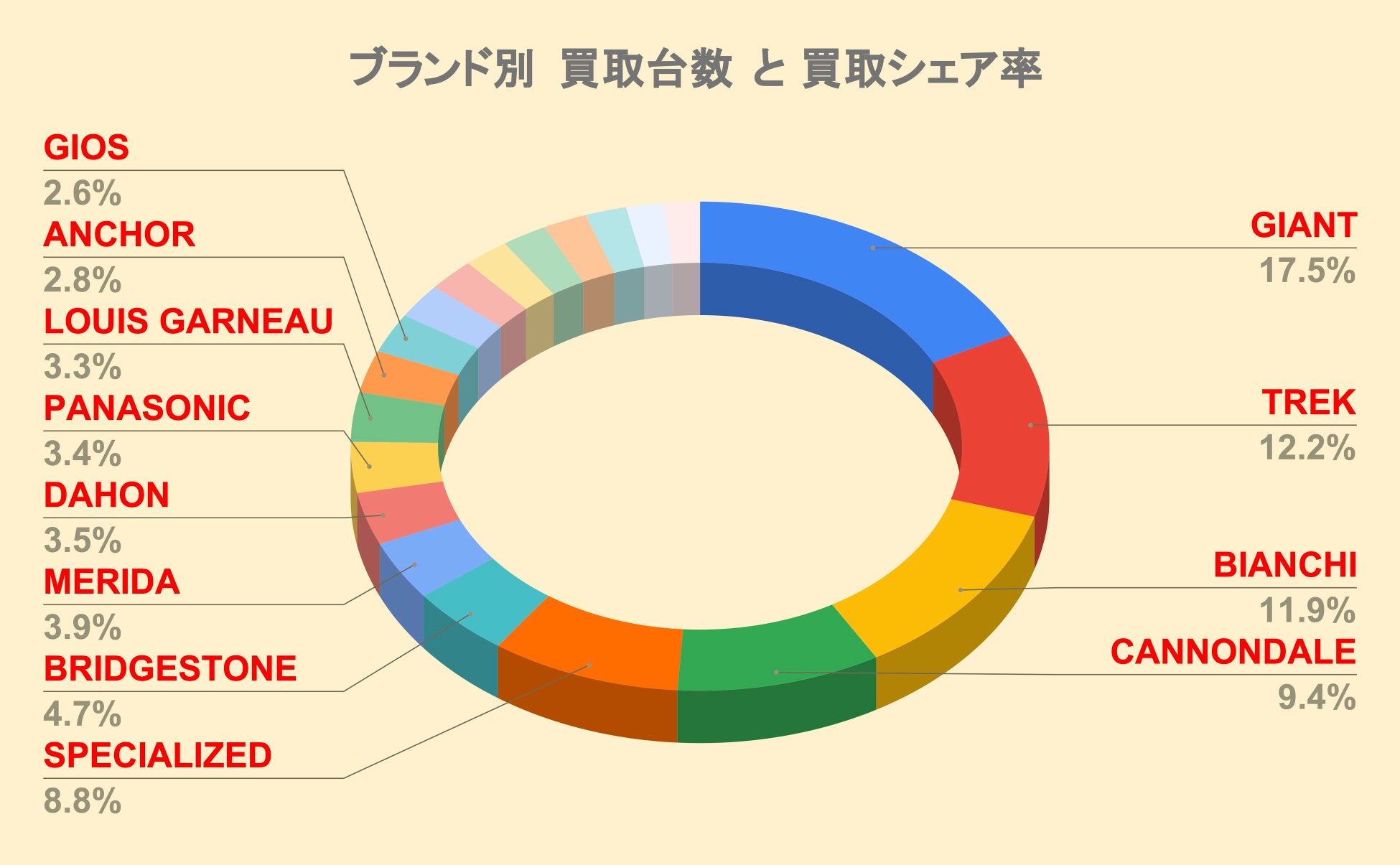 それぞれの買取シェア率は「GIANT(ジャイアント)」が全体の11.3%を占め、「TREK(トレック)」が全体の7.9%、「BIANCHI(ビアンキ)」が全体の7.7%という結果でした。
