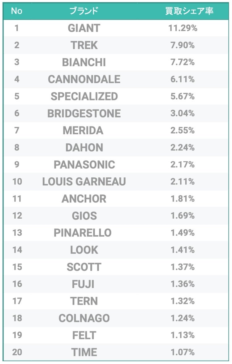 【2023年下半期〜2024年上半期 自転車ブランド別買取数量&シェア率ランキング TOP20】
