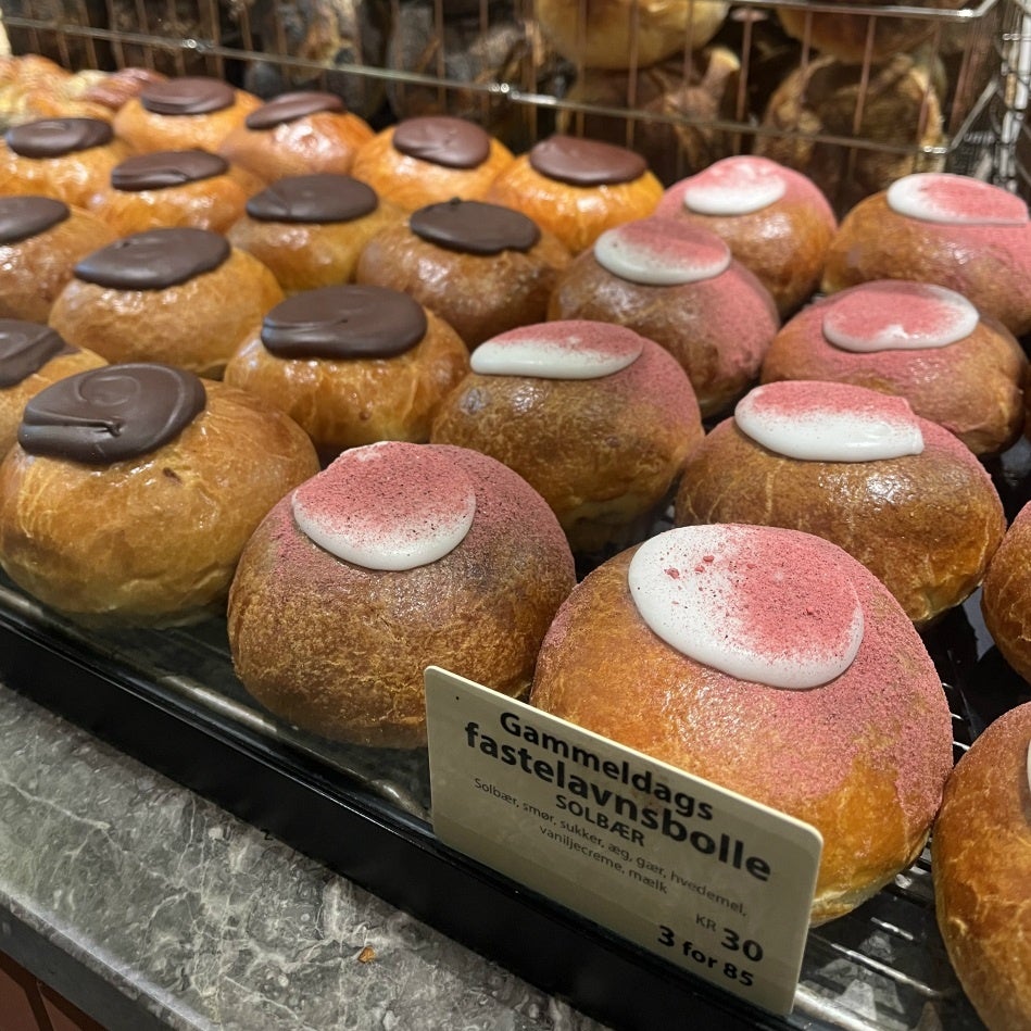このお祭りならではの食べものが「ファステラウンボーラ」。デンマークでは、ファステラウンの約1ヶ月前から街の各ベーカリーで工夫を凝らしたファステラウンボーラが販売されます。 元々は、キリスト教の儀式としてこの時期に断食をする習慣があり、それに備えて食べられていたもの。現在は春の訪れを待ち望むパンとして楽しまれています。